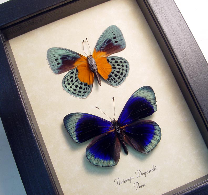 Description: Asterope Degandii Pair Blue Butterflies. This beautiful and unique set features this Peru butterfly species mounted forward and verso to show how different both sides are of this beautiful and amazing butterfly.