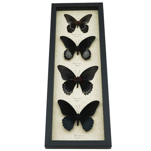 Description: Amazing black gothic butterfly collection featuring four black Papilio butterflies. These stunning black fore ward and verso mounted butterflies have unique shapes and markings. This unique butterfly collection is perfect for the Gothic collector.
