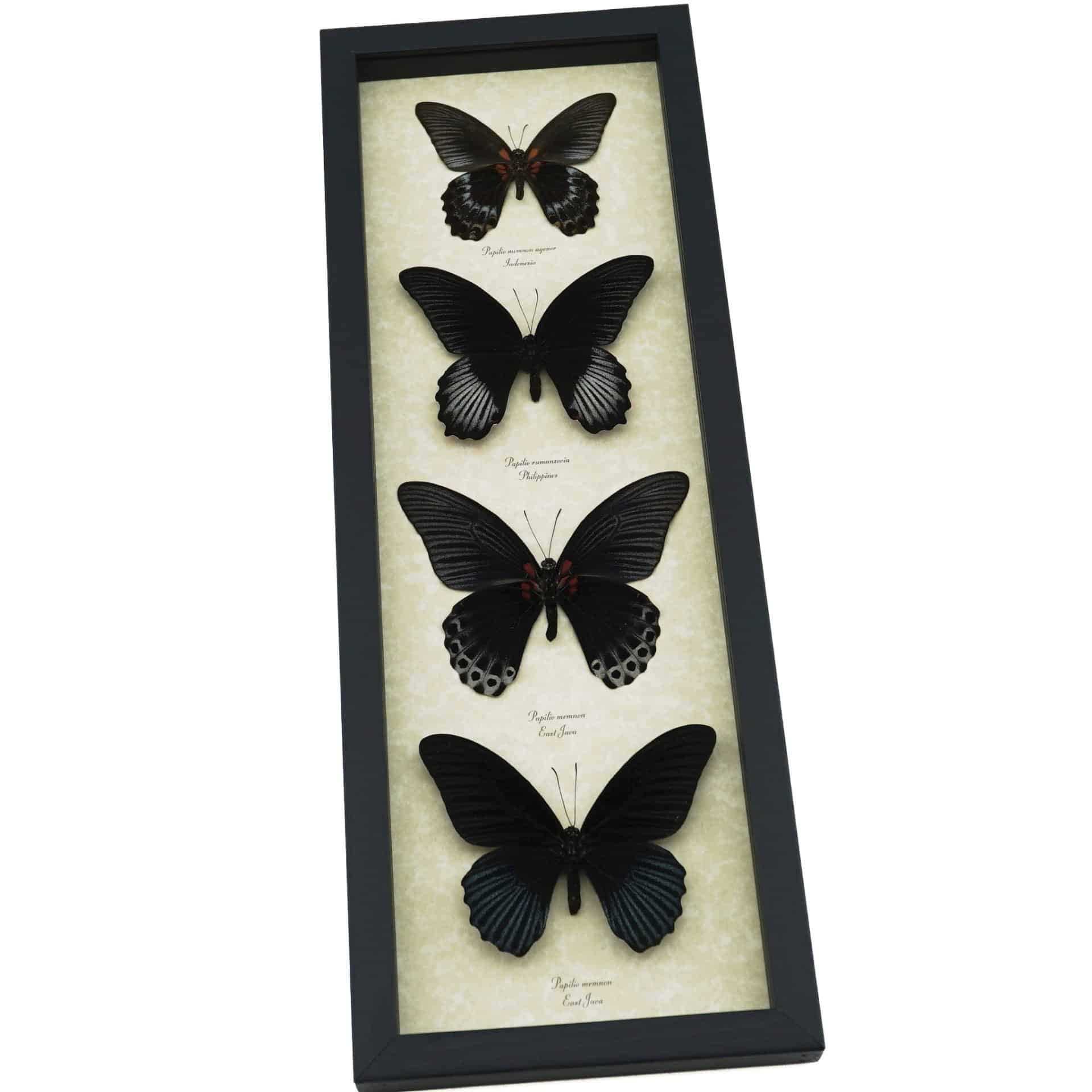 Description: ย Amazing black gothic butterfly collection featuring four black Papilio butterflies. These stunning black fore ward and verso mounted butterflies have unique shapes and markings. This unique butterfly collection is perfect for the Gothic collector.