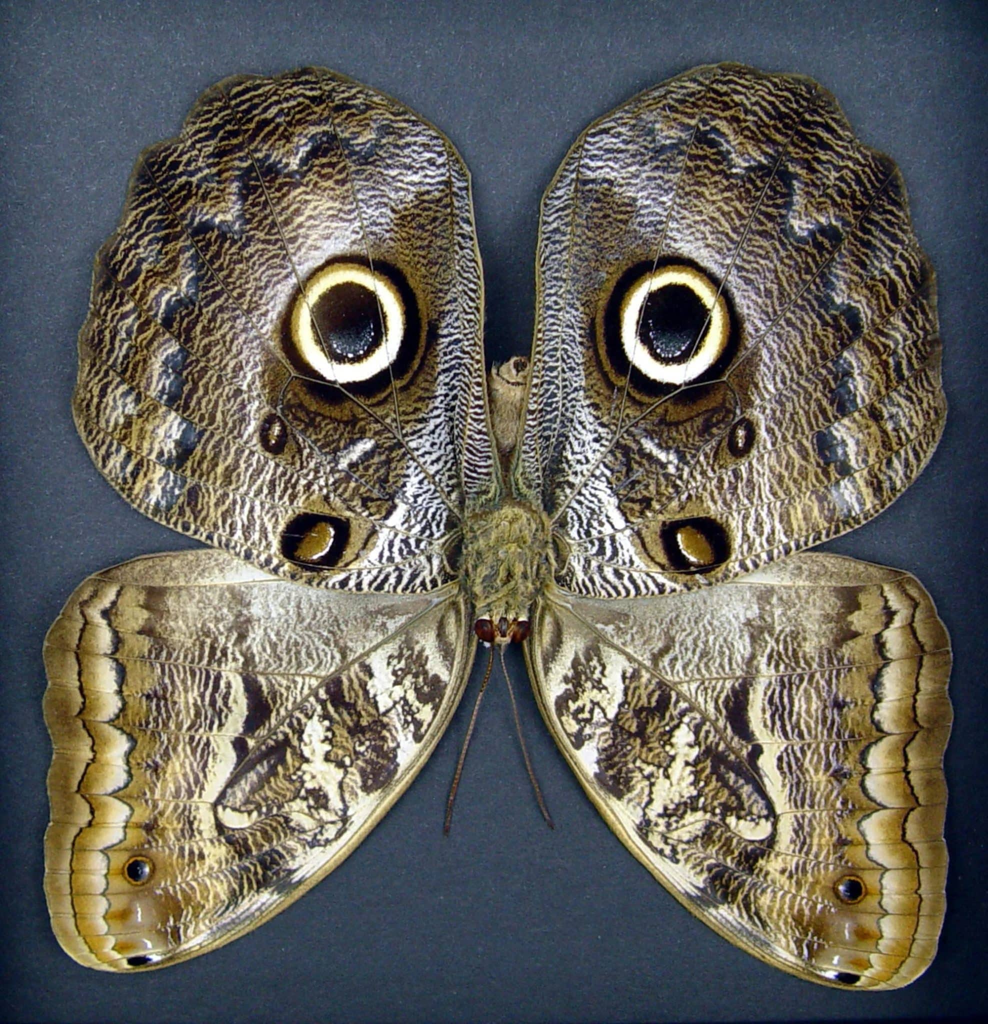 Description: Amazing looking verso mounted owl butterfly that has two eyespots on the underside that looks like large owl eyes to scare off predator’s.