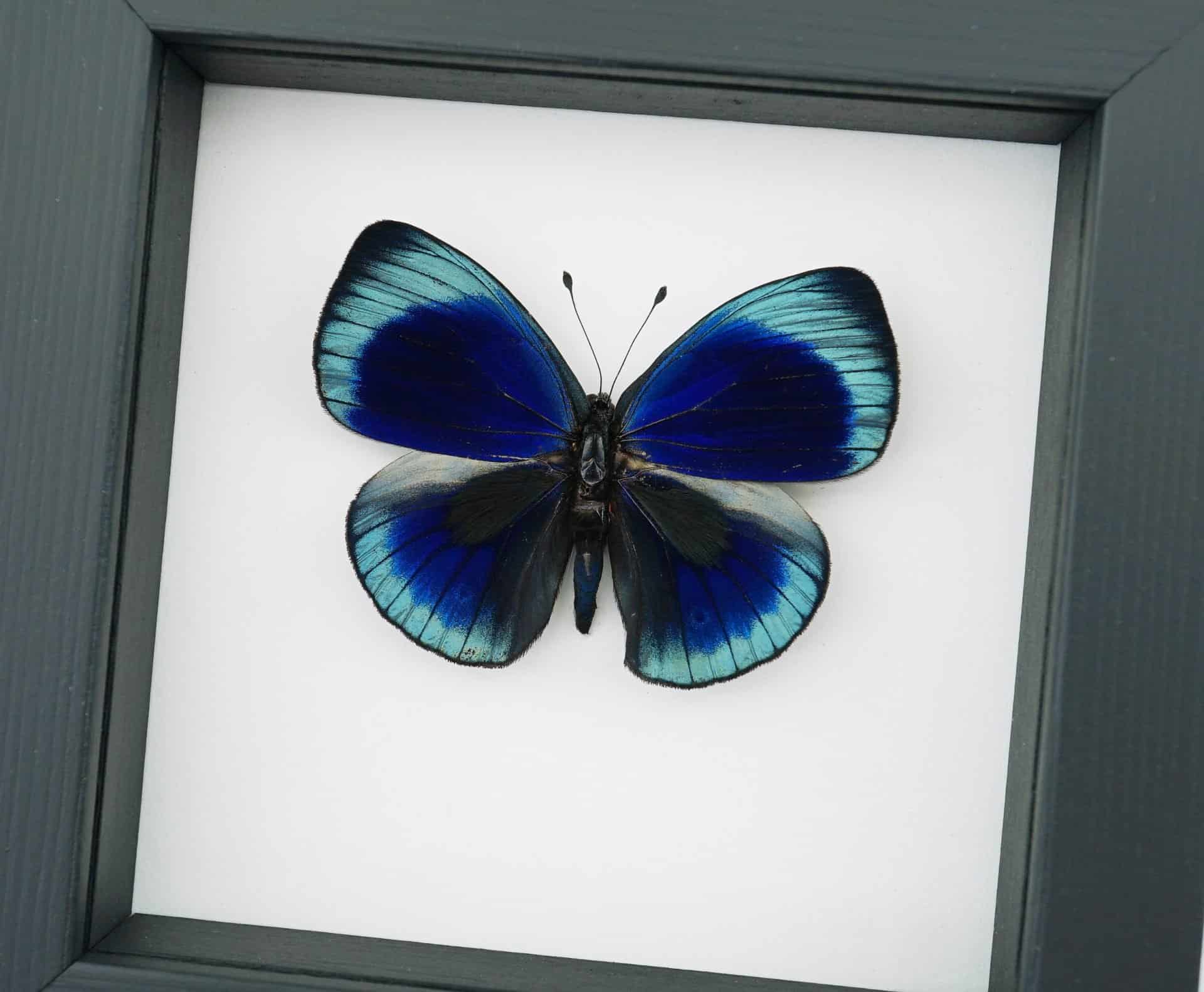 Description: Charles Darwin Butterfly Metallic Blue Butterfly. ย Charles Darwin noted that of all the species of butterflies that the female of this richly colored butterfly is surprisingly similar to the male.ย Many female butterflies don’t even resemble their male counterparts.