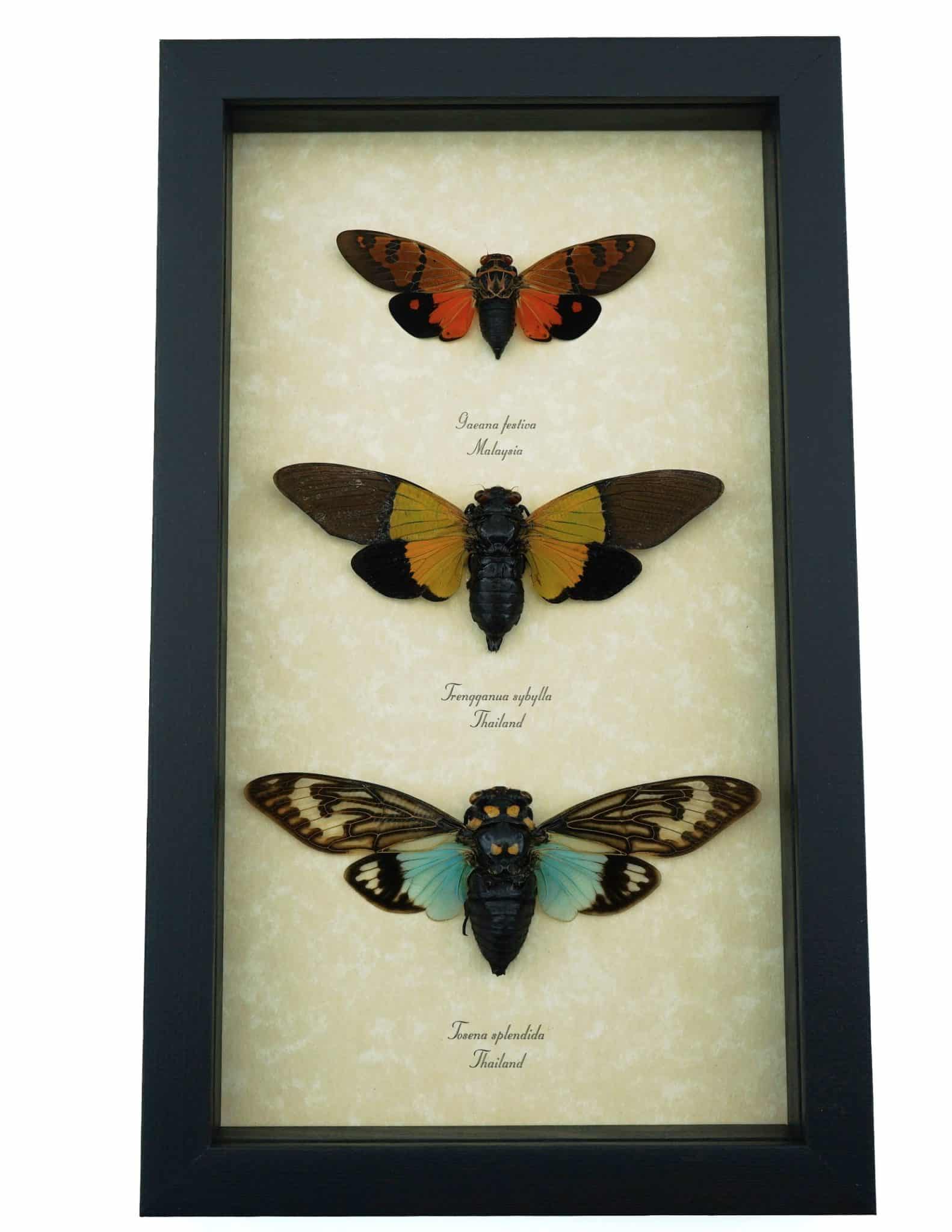 Description: Unique colorful set of blue, orange and green cicadas from Thailand & Malaysia.