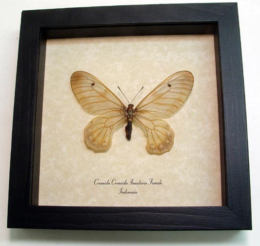 Description: Cressida Cressida Insularis female Swallowtail. This rare and hard to get stunning and unique tailless swallowtail butterfly has clear transparent wings.