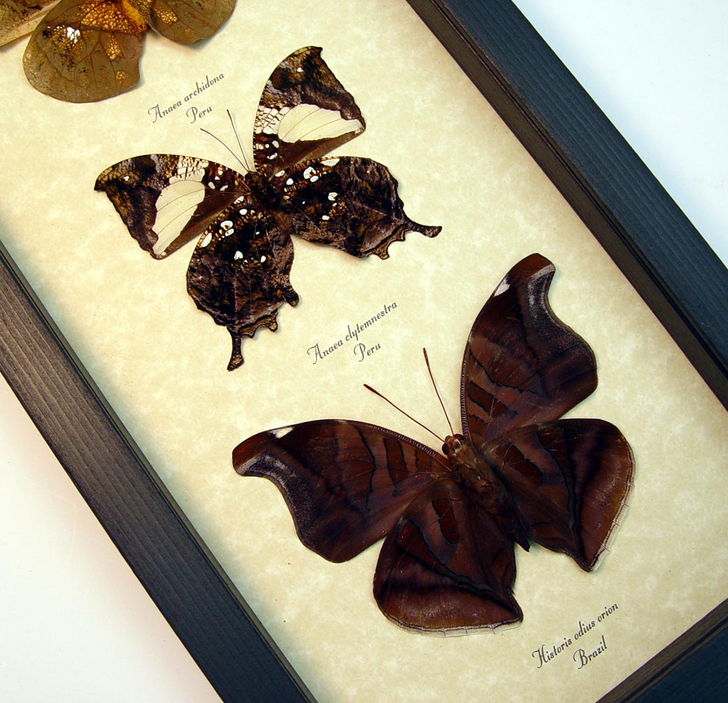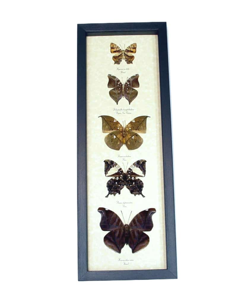 Description: Dead Leaf Mimic Butterfly Collection. Amazing brown dead leaf mimic Butterfly Collection. These stunning verso mounted butterflies have markings and textures that mimic and resemble dead leaves. This will make a wonderful and unique collection for your home or office. These unique one of a kind collections include 5 real Butterflies.
