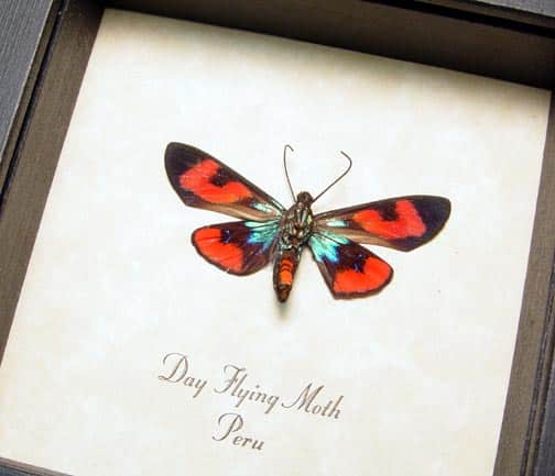 Description: Rare hard to getย verso mounted Peruvian day flying moth. This moth has hints of electric blue and red markings.