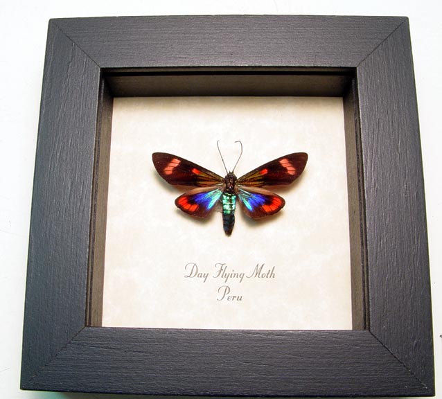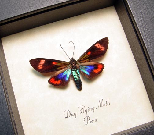 Description: Rare hard to get Peruvian day flying moth. This moth has hints of electric blue and red markings.