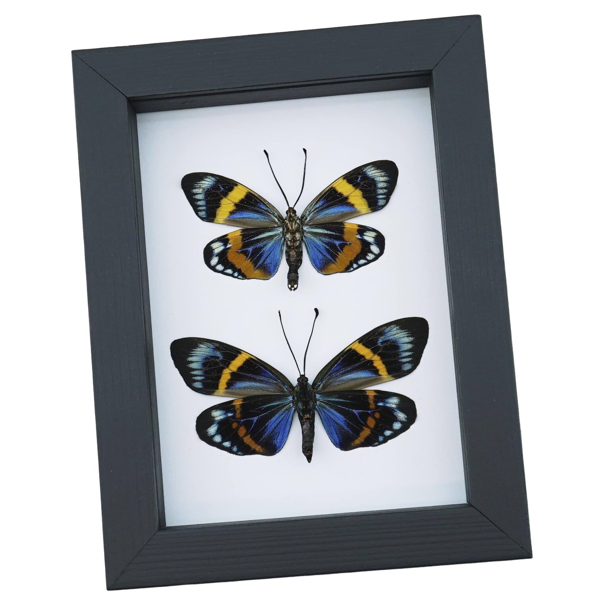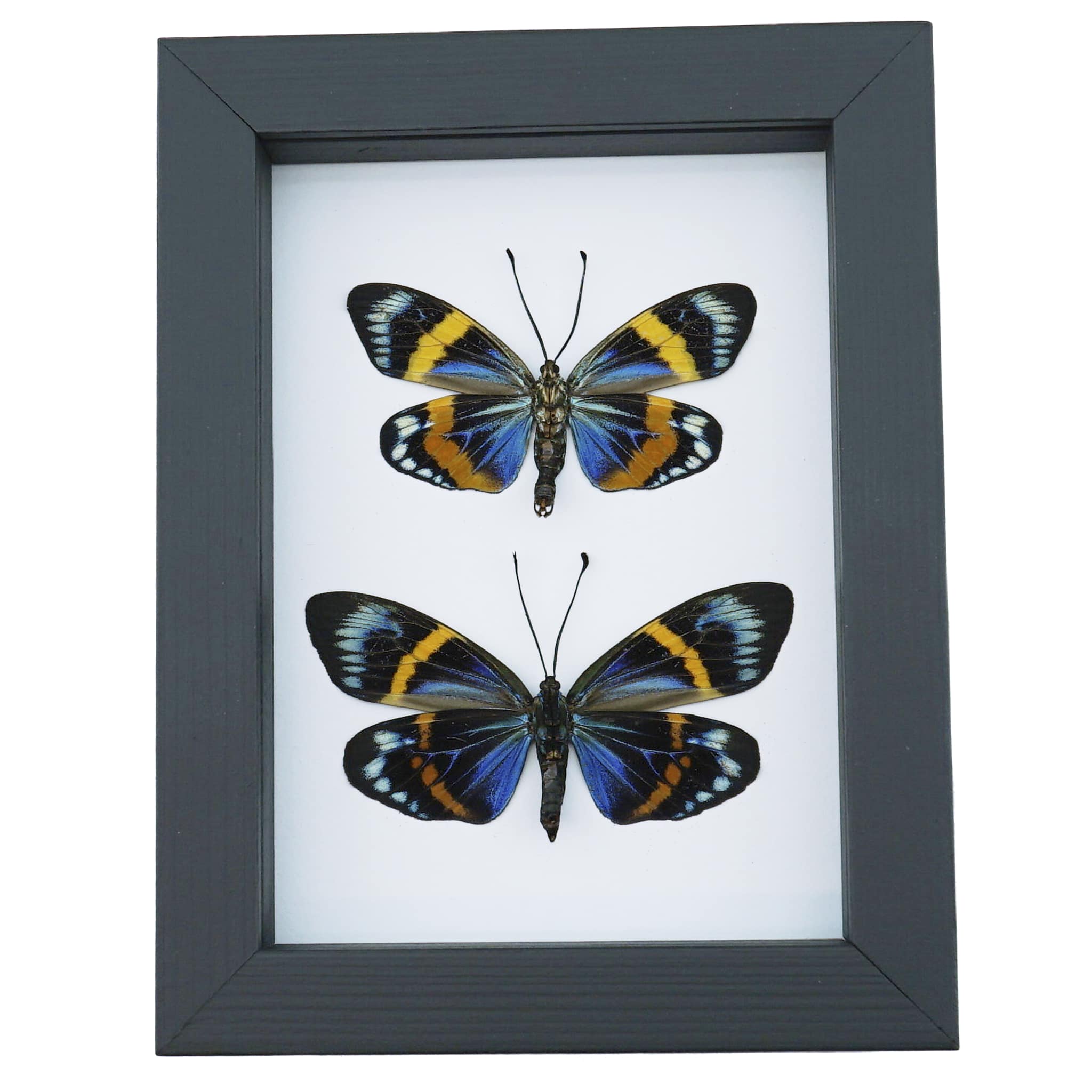 Description: Stunning pair of verso mounted metallic blue and orange hard to get male female day flying moths from India. These Amazing electric blue and orange day flying moths have amazing colors!