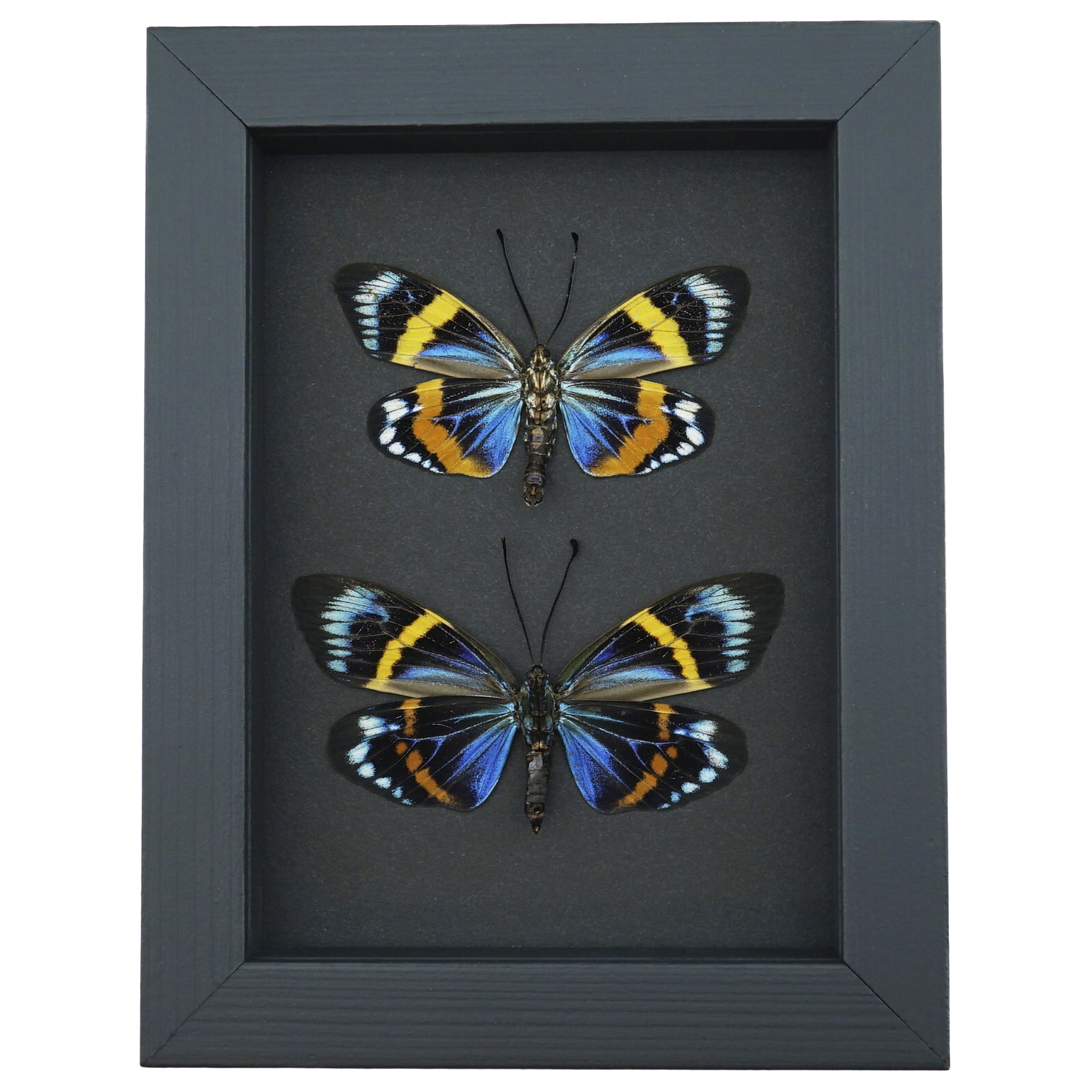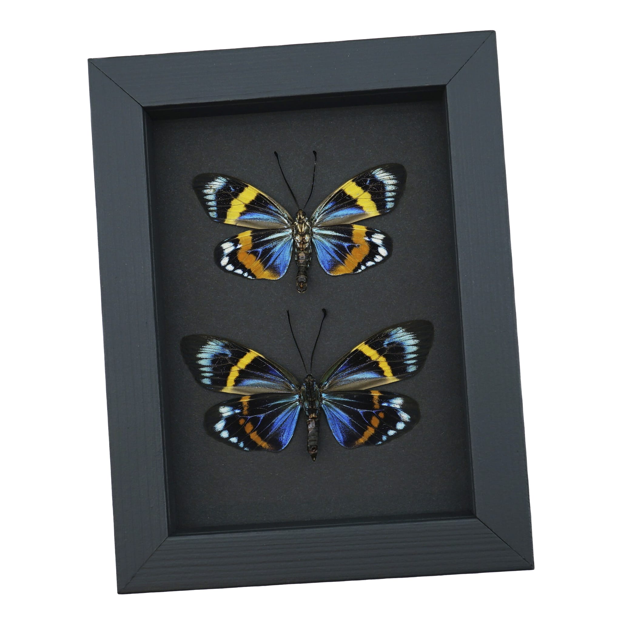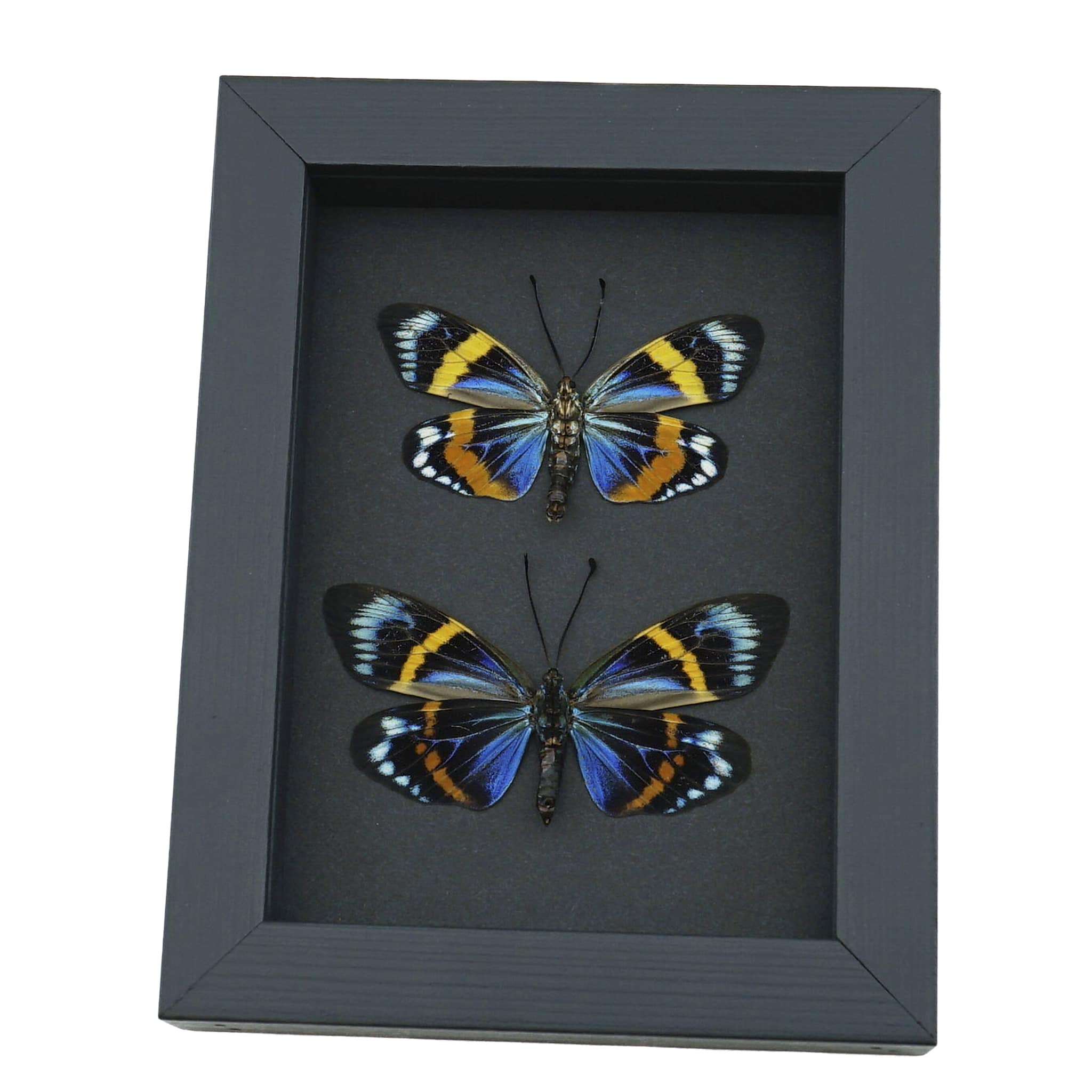 Description: Stunning pair of verso mounted metallic blue and orange hard to get male female day flying moths from India. These Amazing electric blue and orange day flying moths have amazing colors!