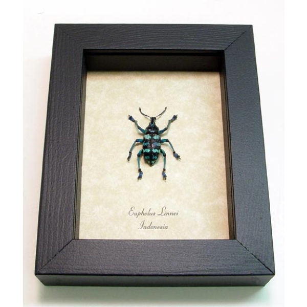 Description: Colorful blue striped Weevil commonly known as the Blue Banded Snout Weevil. Eupholus is a genus of beetle in the family Curculionidae. These beetles are known as the jewels of the forest. The species include some of the most colourful of the weevils. The colour may be a warning to predators that they are distasteful. Most species feed upon yam leaves, some of which are toxic to other animals. The species occur in PNG, West Irian, and adjacent Islands.