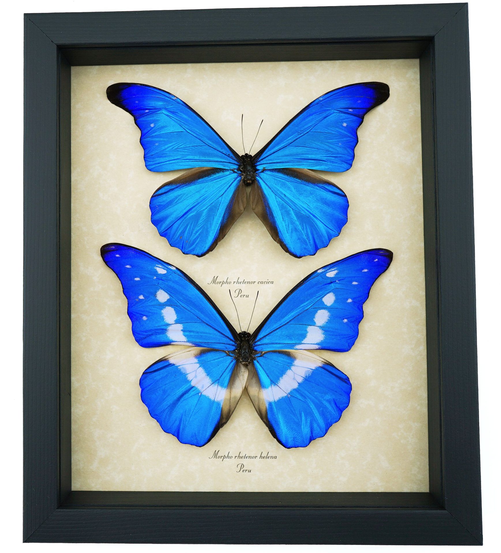 Description: Morpho rhetenor helena cacica Set. stunning rare blue Morpho butterfly set featuring 2 of the most beautiful rare blue morphos. There are over 80 species of blue morpho butterflies mostly found in South America as well as Mexico and Central America. This Blue Morpho is one of the most beautiful and highly prized and collected morphos in the world. Unlike most blue morphos this rare species has white patches on the wings.
