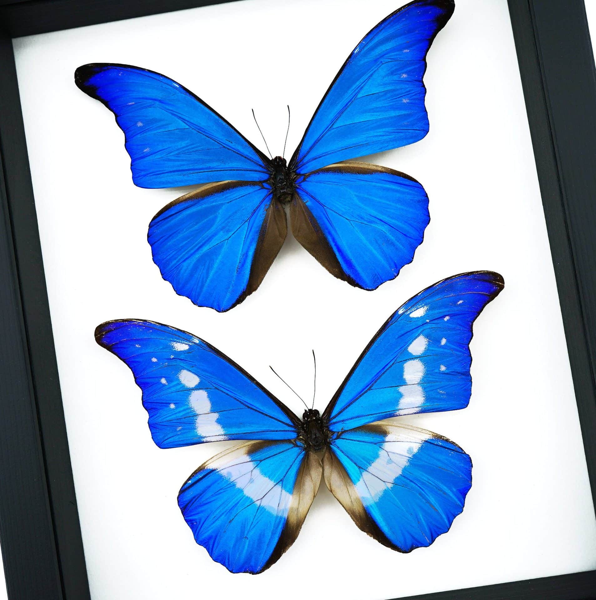 Description: Morpho rhetenor helena cacica Set. stunning rare blue Morpho butterfly set featuring 2 of the most beautiful rare blue morphos. There are over 80 species of blue morpho butterflies mostly found in South America as well as Mexico and Central America. This Blue Morpho is one of the most beautiful and highly prized and collected morphos in the world. Unlike most blue morphos this rare species has white patches on the wings.