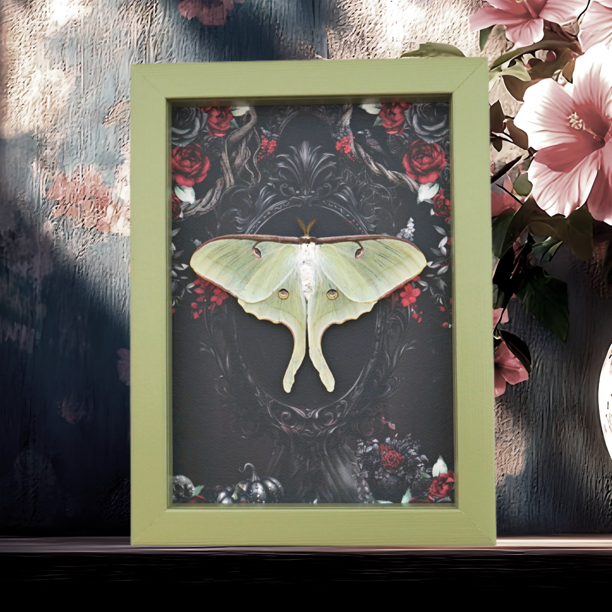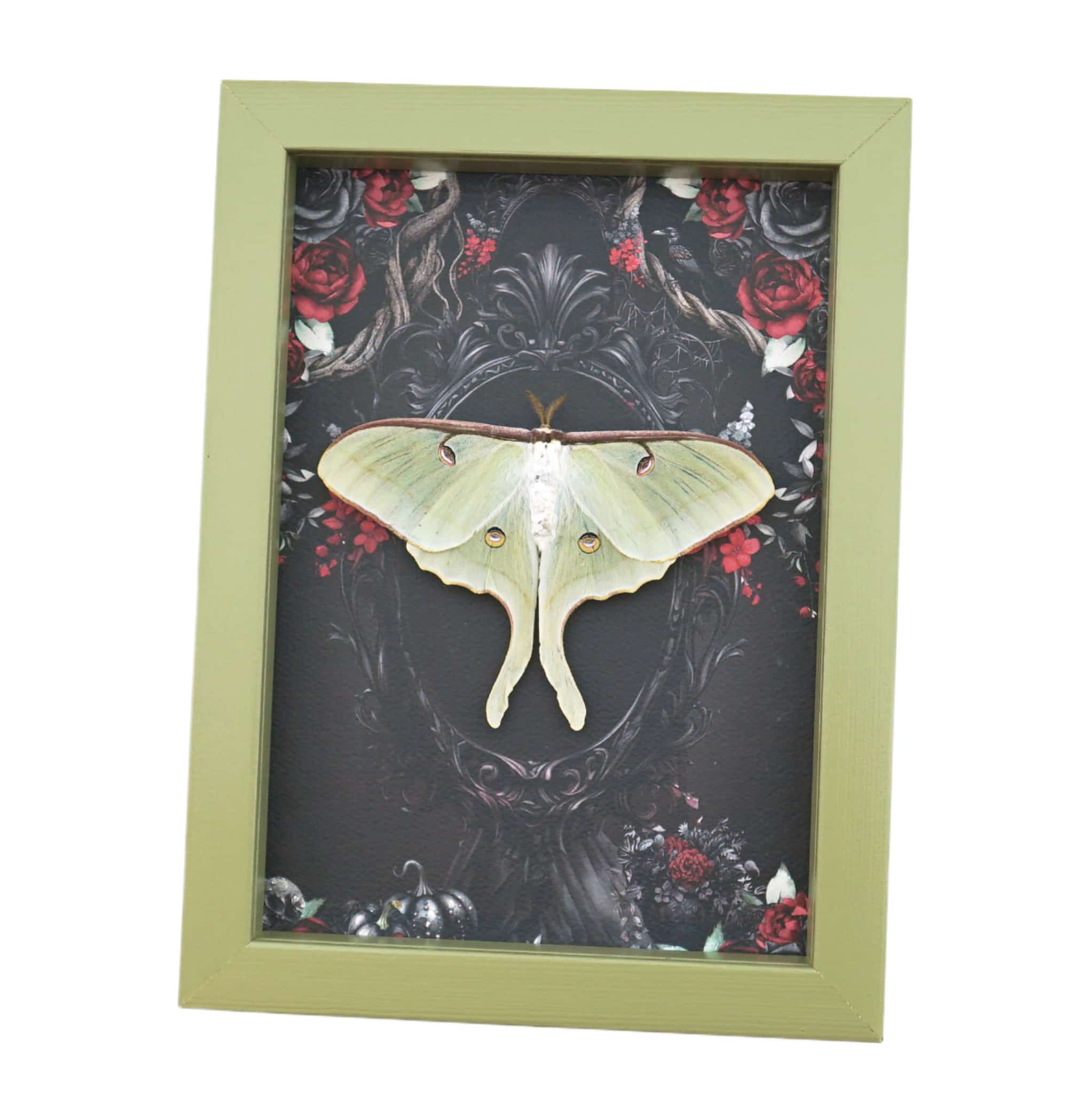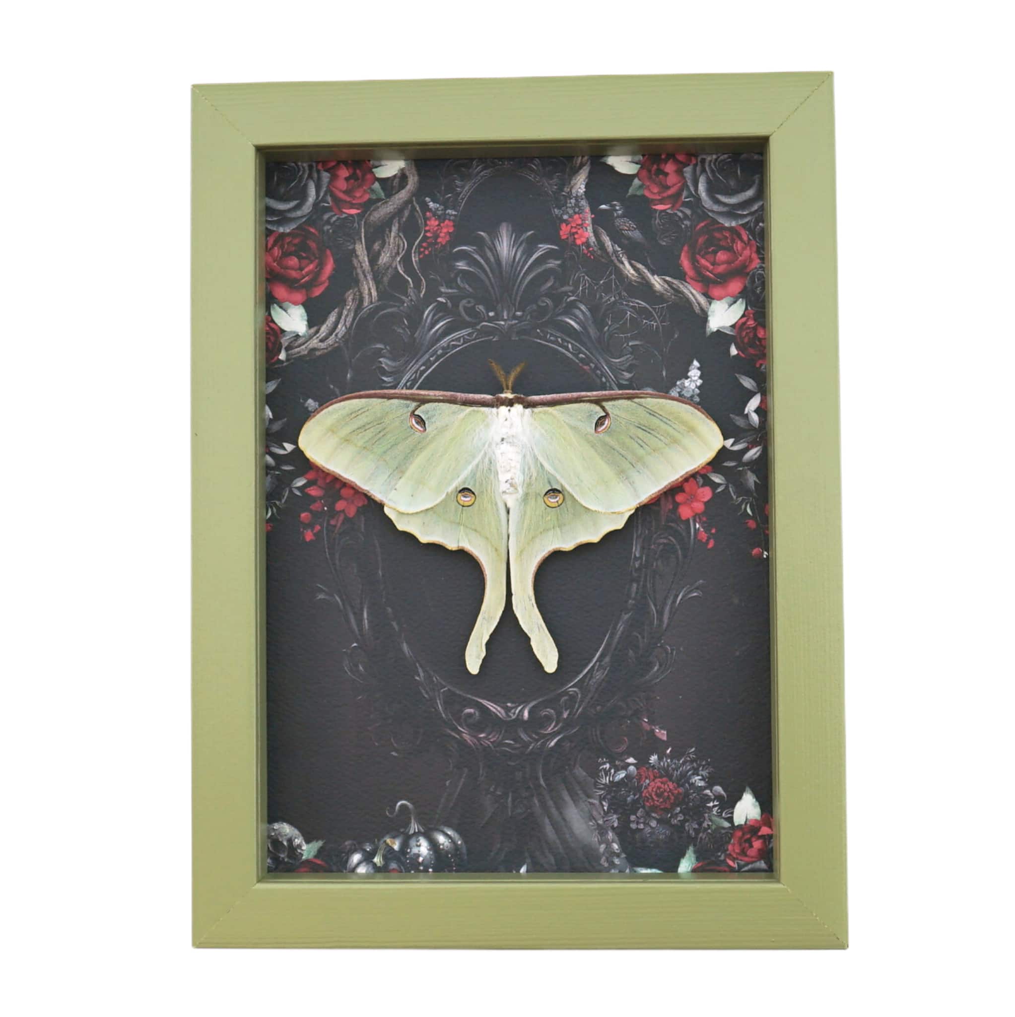 Framed Luna Moth Gothic Black Roses Actias luna Resting Framed Taxidermy Sage Green