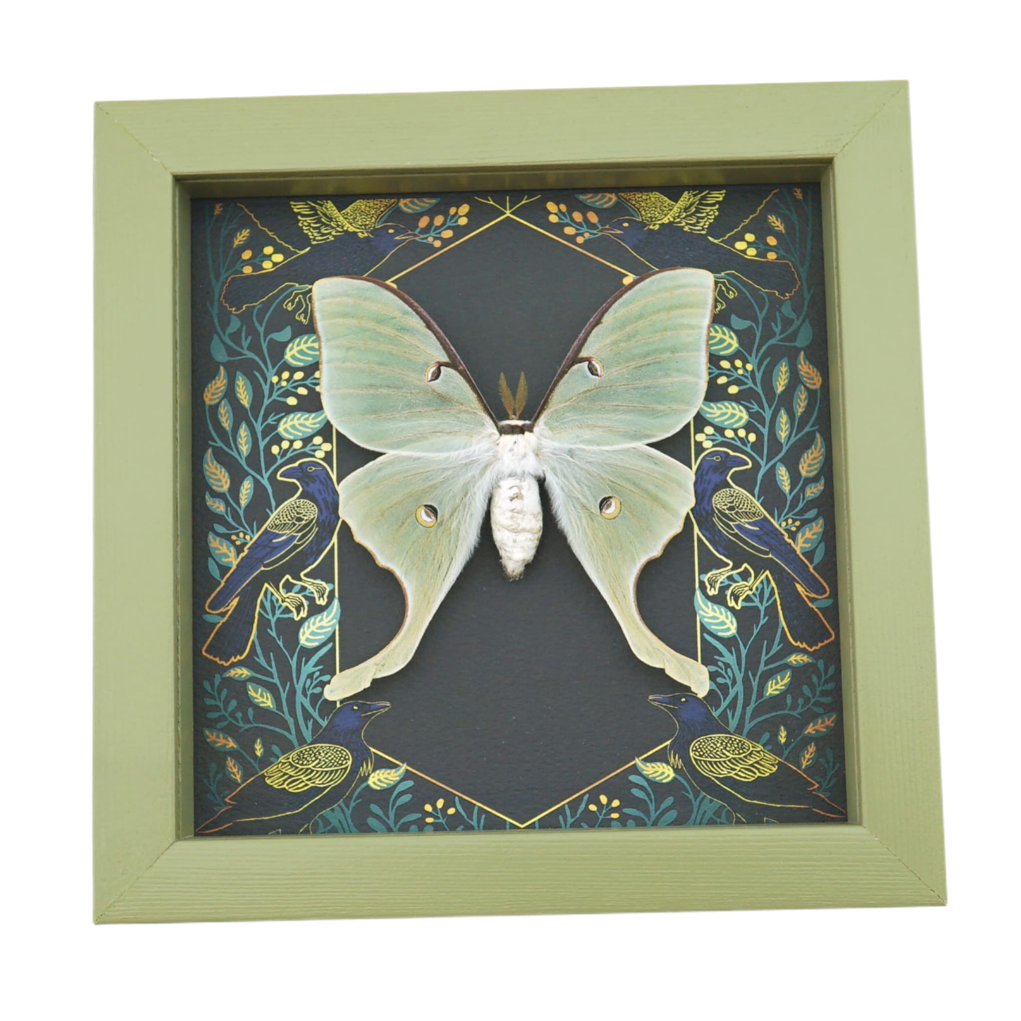 Framed Luna Moth Gothic Ravens Actias luna Taxidermy Sage Green Display