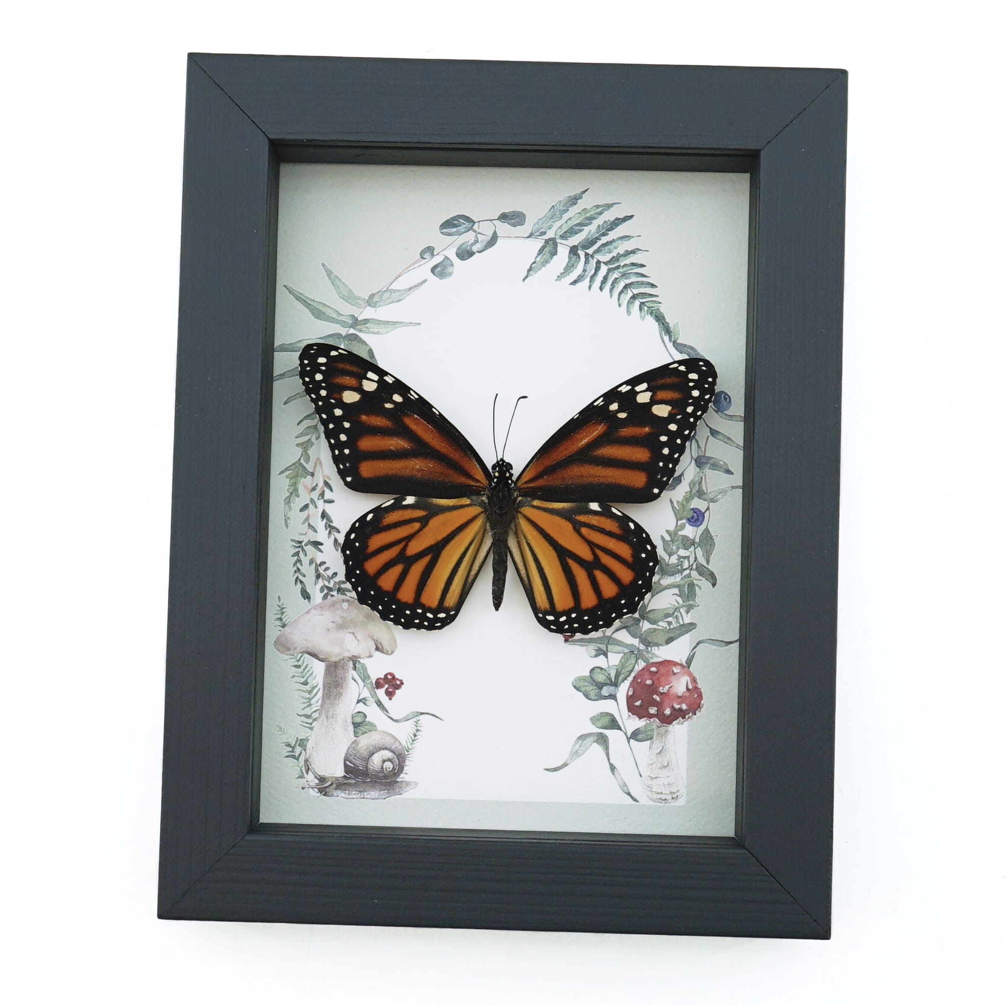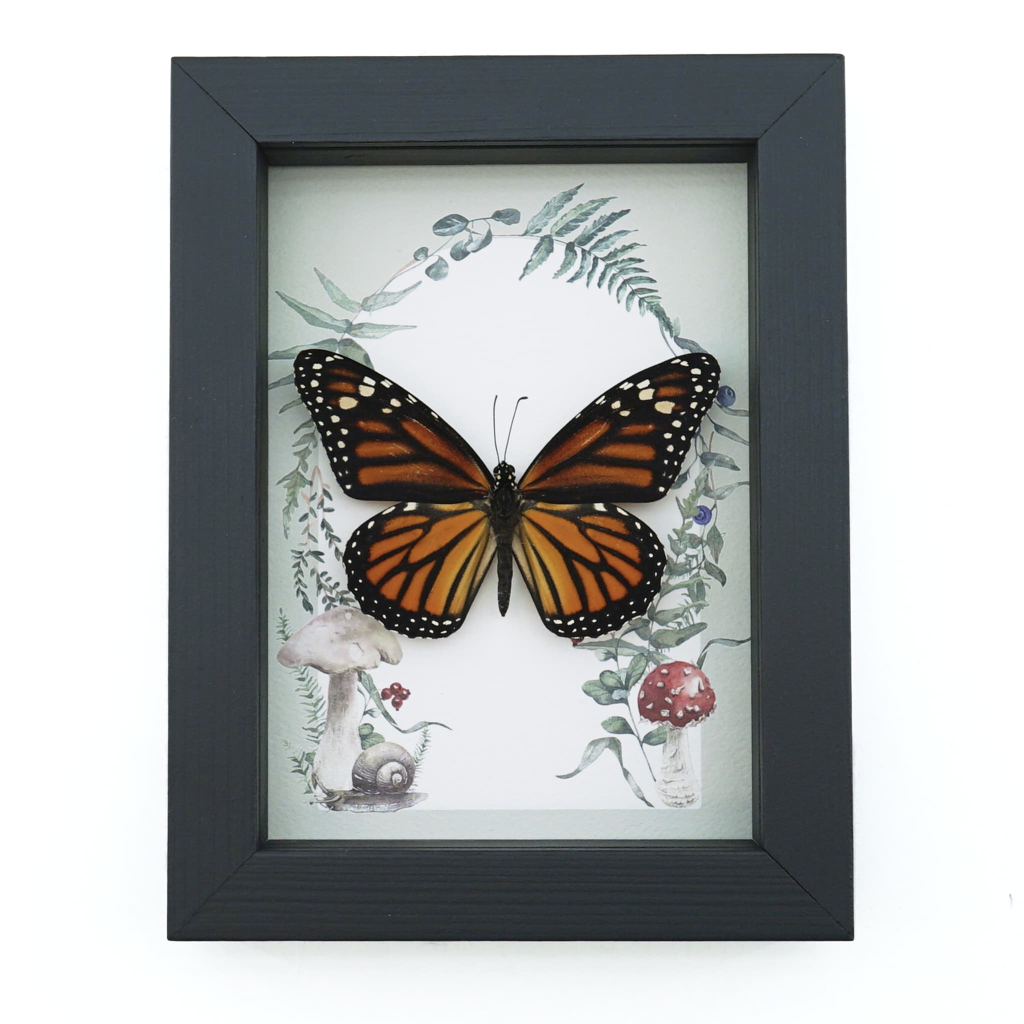 Framed Monarch Butterfly Forest Mushrooms Ferns Danaus plexippus Female Taxidermy Display