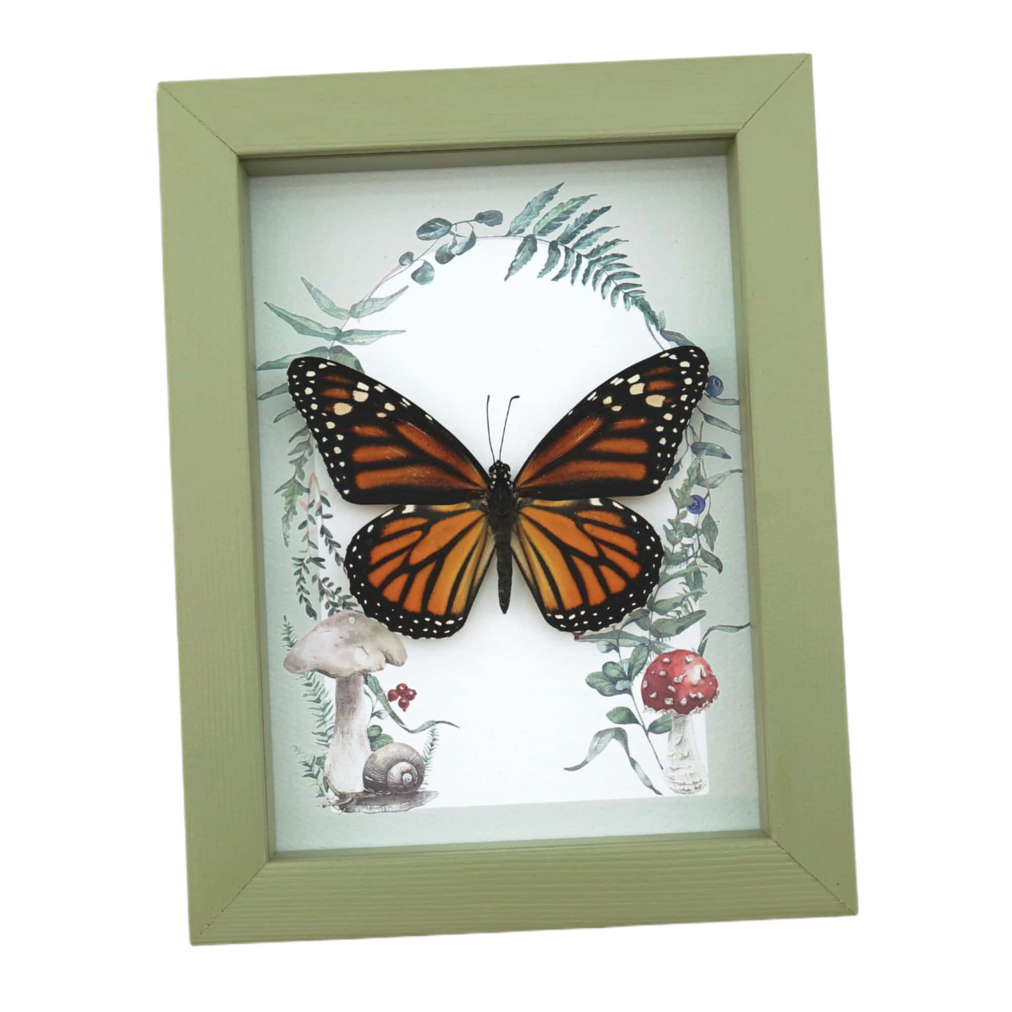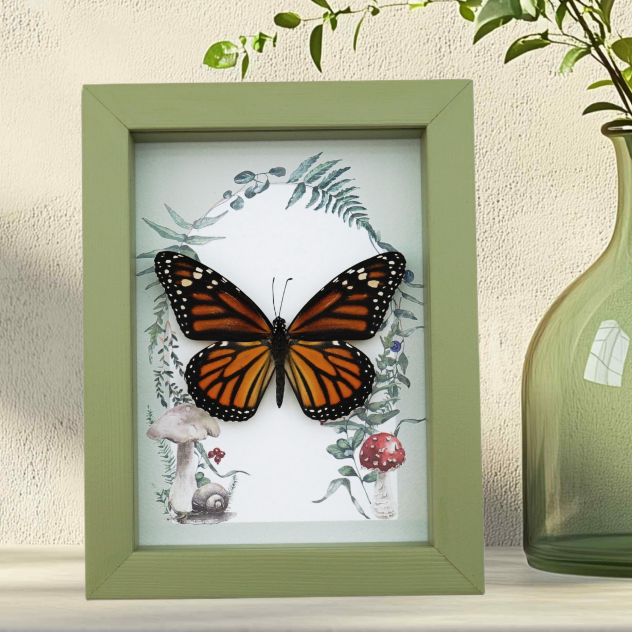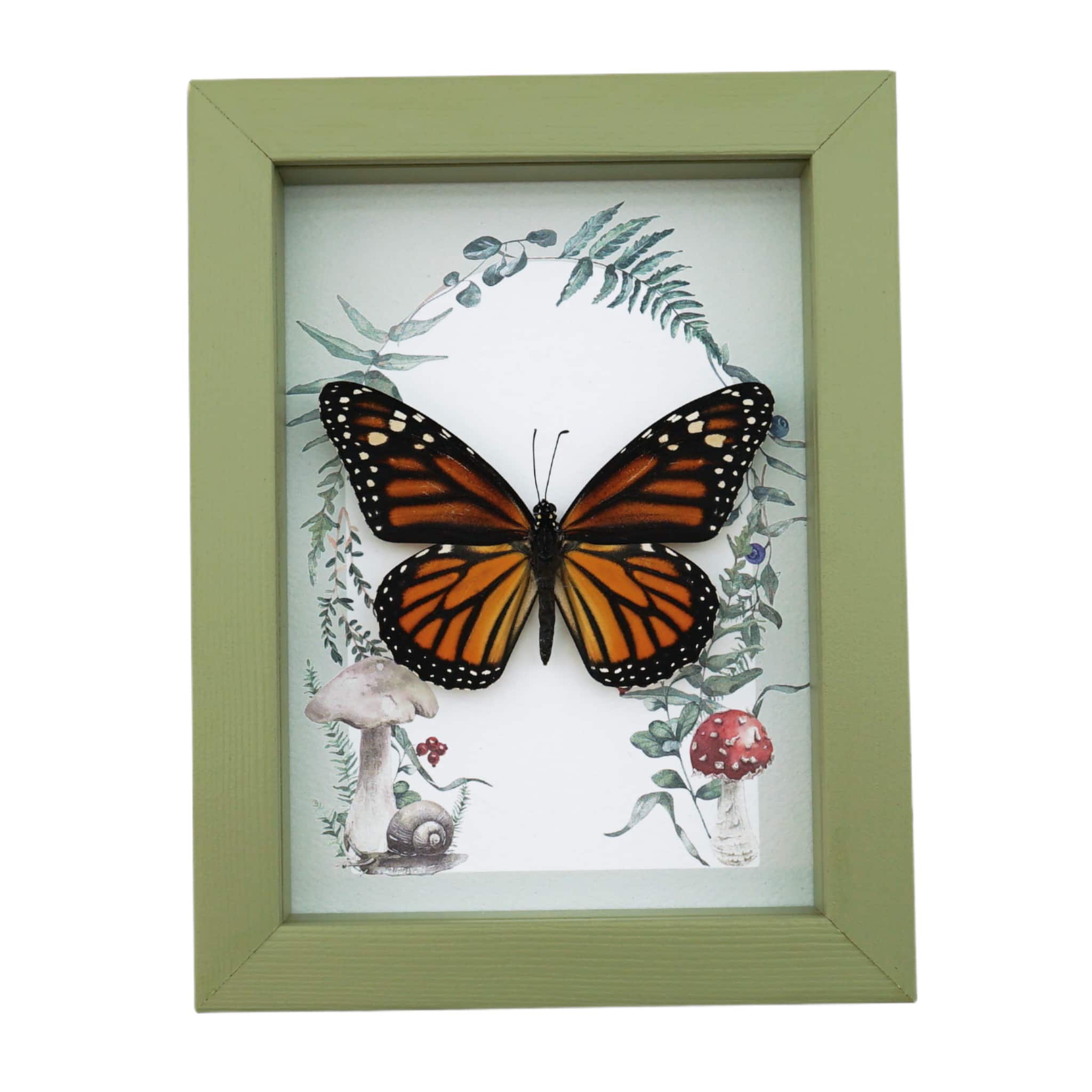 Framed Monarch Butterfly Forest Mushrooms Ferns Danaus plexippus Female Taxidermy Sage Green Display