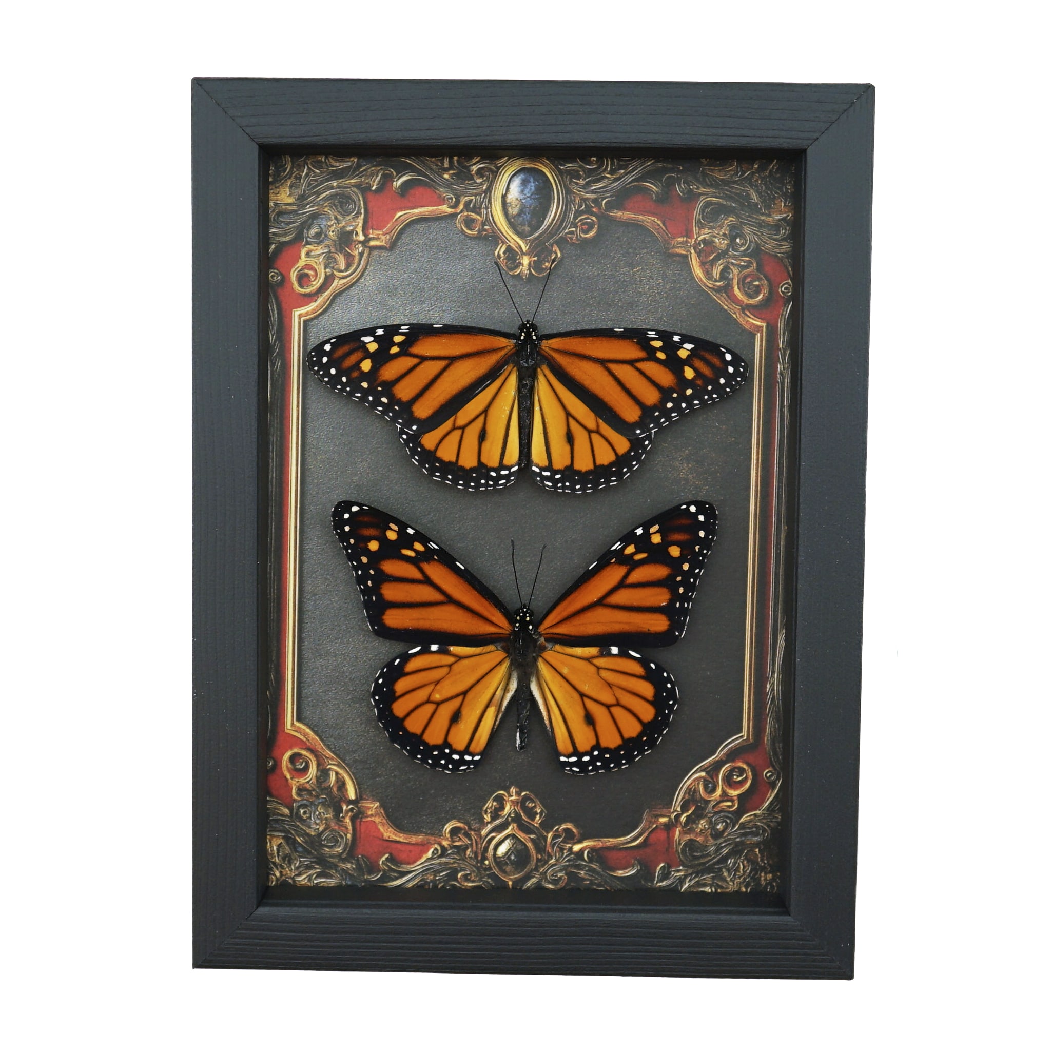 Framed Monarch Butterfly Set Gothic Red Border Danaus Plexippus Resting Taxidermy Display