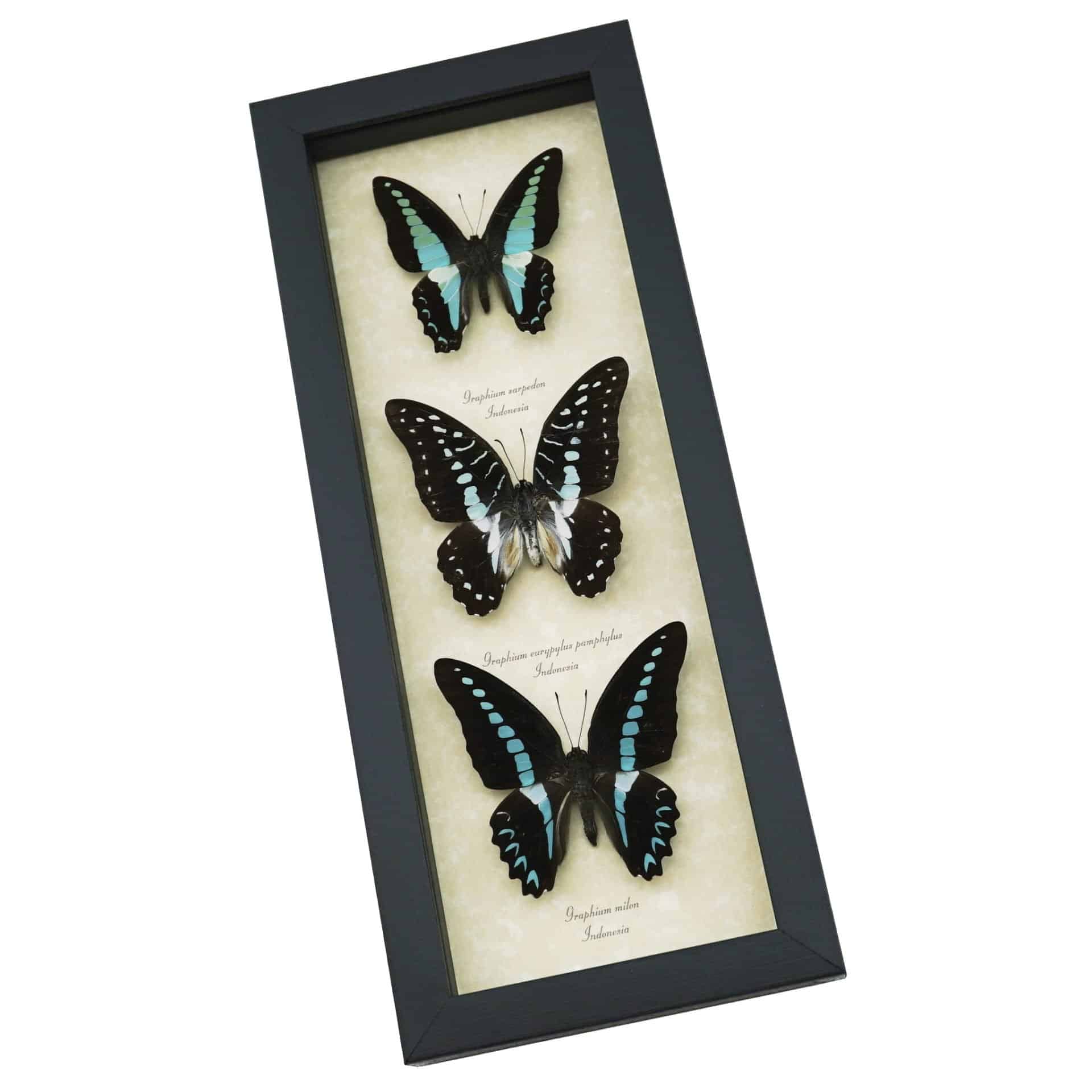 Description: This blue Graphium butterfly collection has three of the most beautiful blue butterflies found in the Asian/Australian region. These are commonly known as the the Common Bluebottle, the great Jay and milans swallowtail.