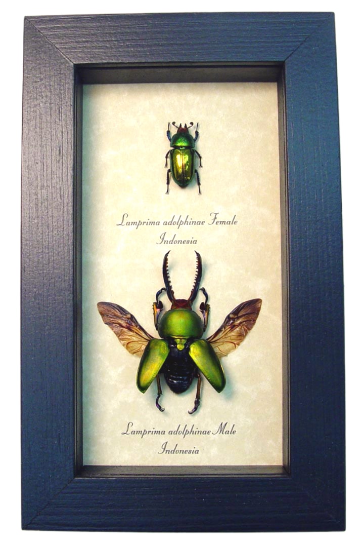 Description: Lamprima Adolphinae Flying Beetle Set. This unique set features a flying male beetle and a metallic green female. The male has long serrated saw tooth mandibles, perfect for fighting. Male stag beetles use their jaws to wrestle each other for mating rights. Fights may also be over food, such as tree sap and decaying fruits. Despite their appearance they are not normally aggressive to humans. The female is much smaller and has even brighter shiny metallic green colors.