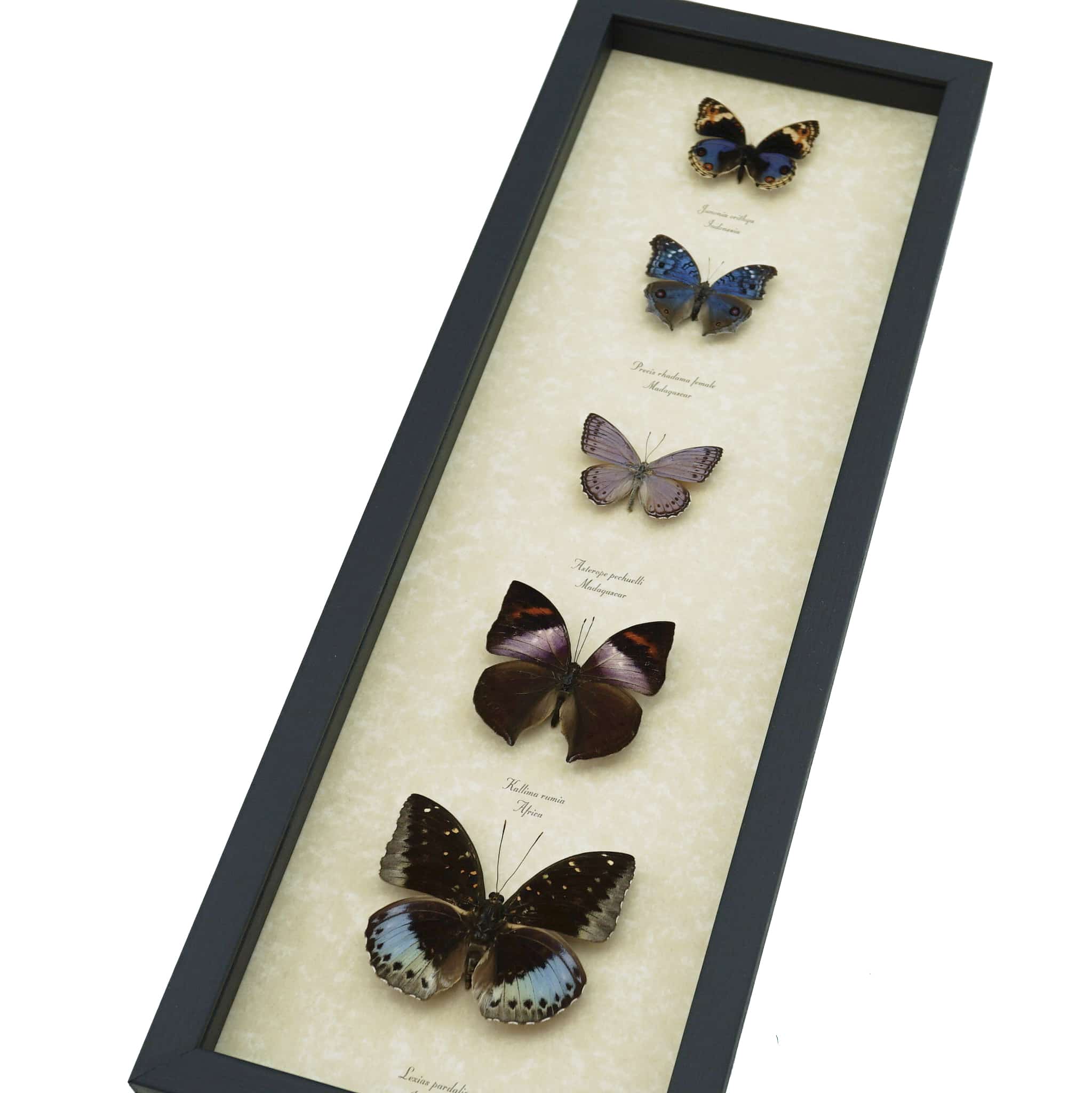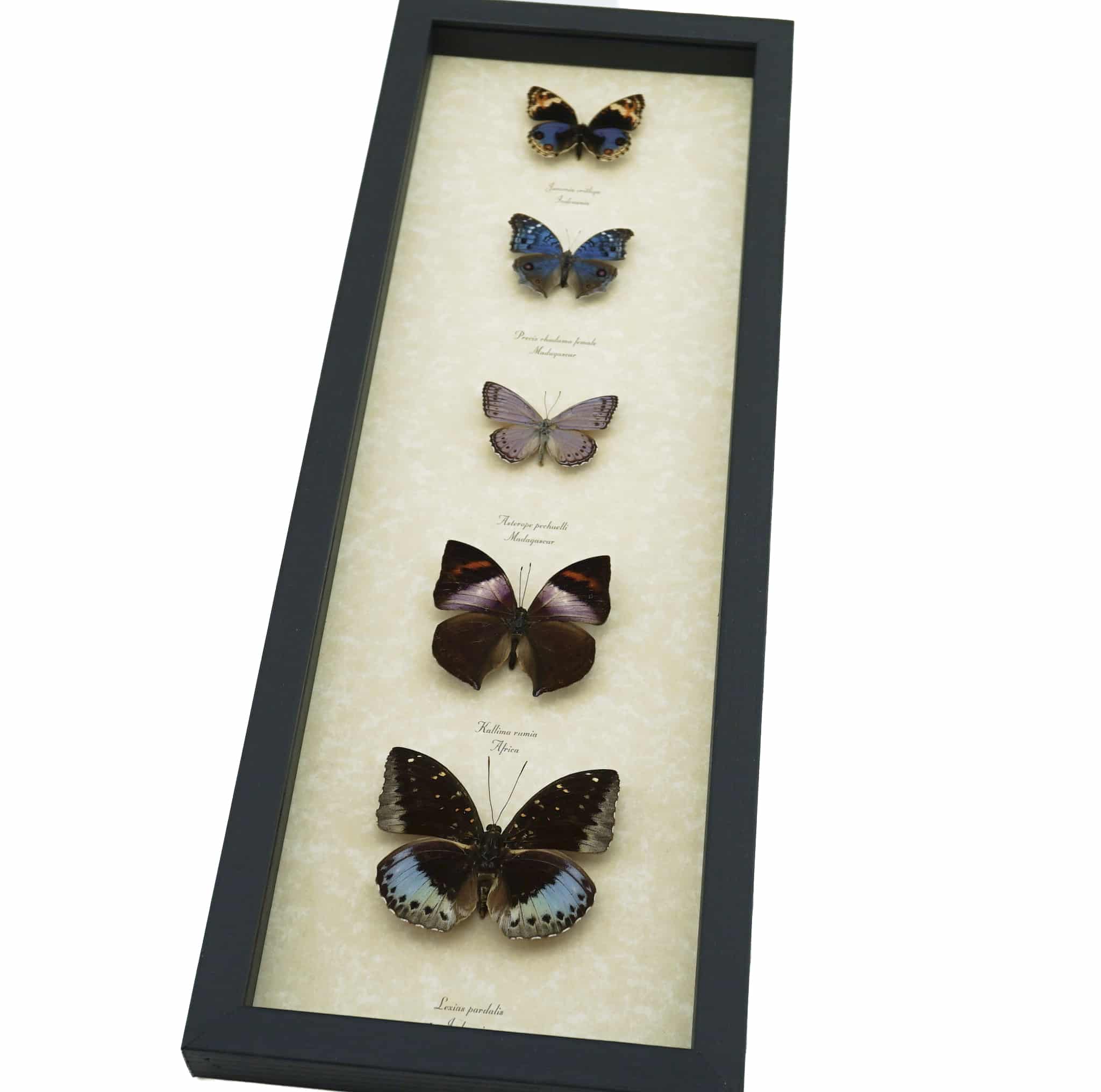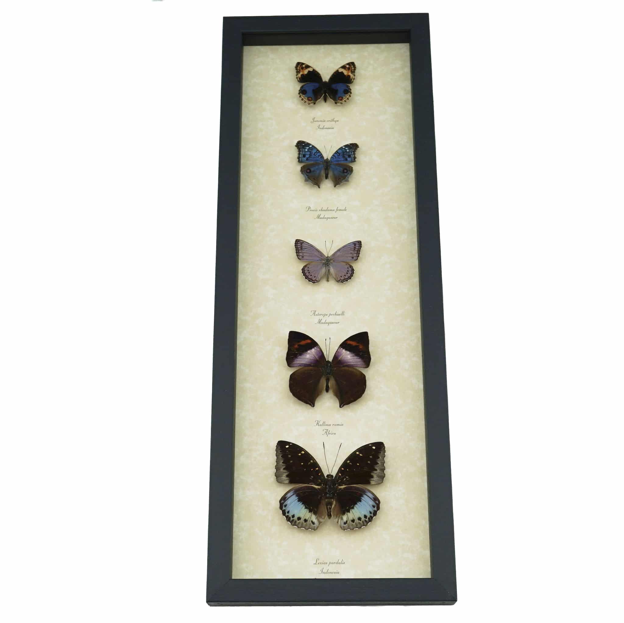 Description: Lavender Butterfly Collection real framed butterflies. Amazing lavender Butterfly Collection. These stunning mounted butterflies have lavender markings. This will make a wonderful and unique collection for your home or office. These unique one of a kind collections include 5 real Butterflies.