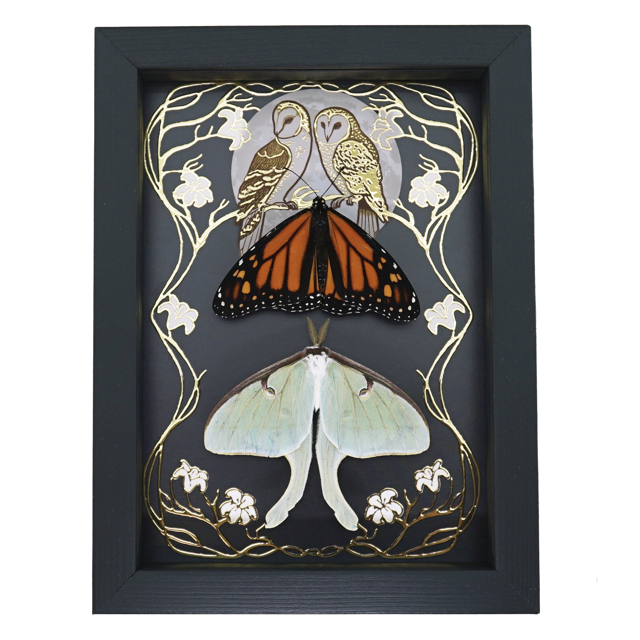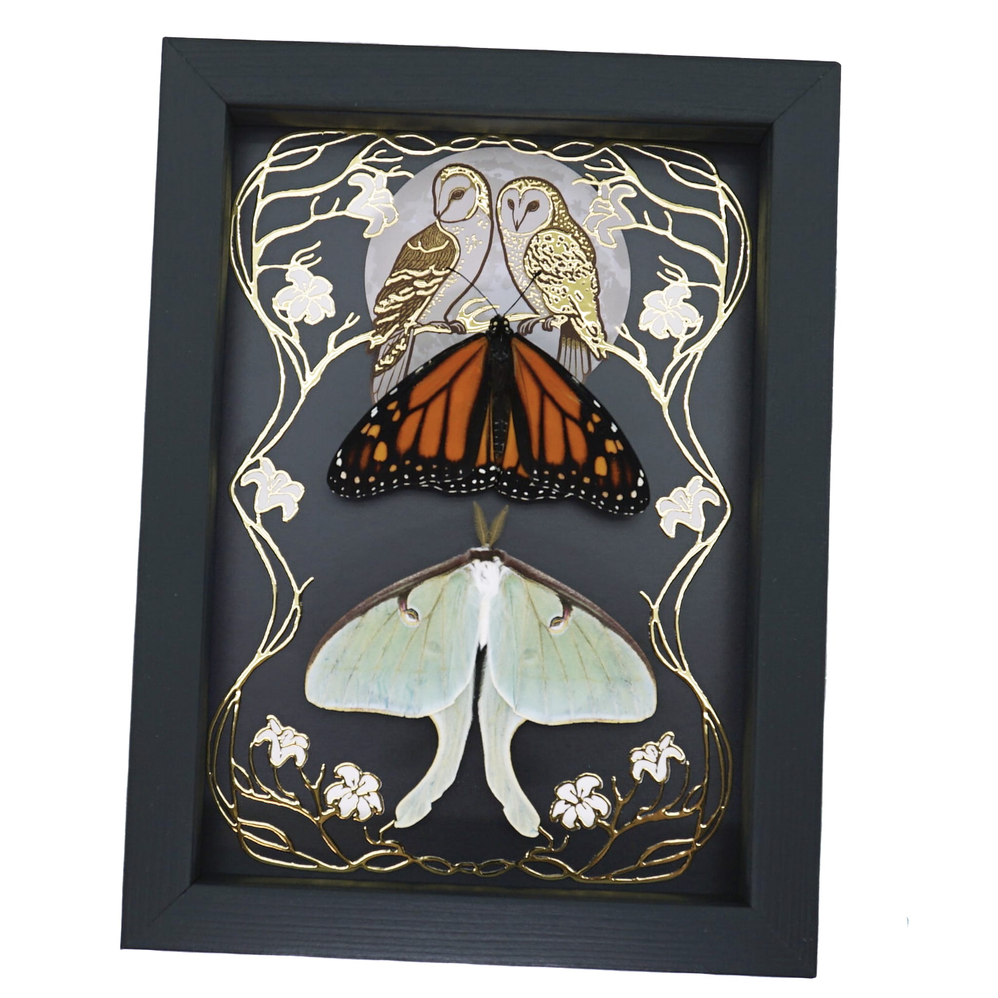Luna Moth Monarch Butterfly Collection Gold Foil Owls Moon Art Nouveau Framed Taxidermy