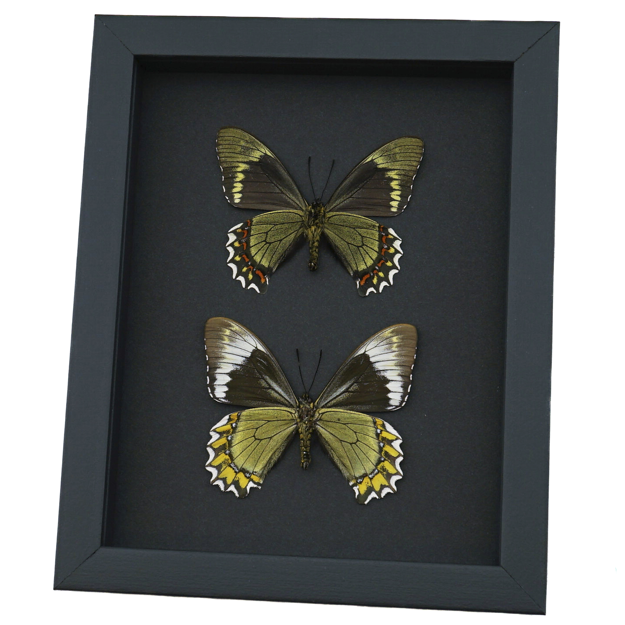 Description: This unique butterfly collection features two species of verso mounted Battus butterflies. The Battus Madyes Chlorodamas has unique yellow edging while the Battus madyes magnimacula has deep red edging. These butterflies are commonly known as the Madyes Swallowtail butterflies.