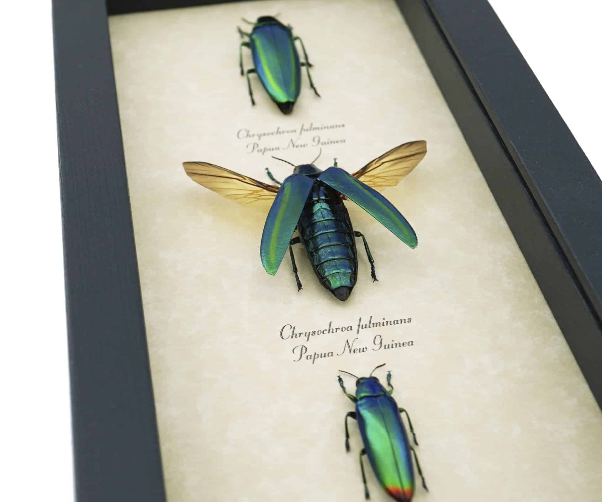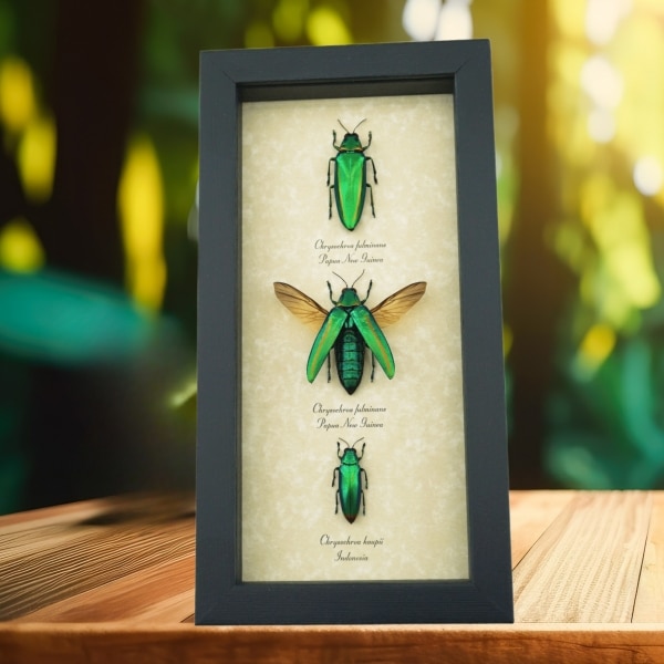 Description: Stunning set of 3 metallic green jewel beetlesย commonly known as a Metallic wood boring beetles. Living Jewel beetles are fascinating insects and have been used as jewelry and fashion accessories for centuries.