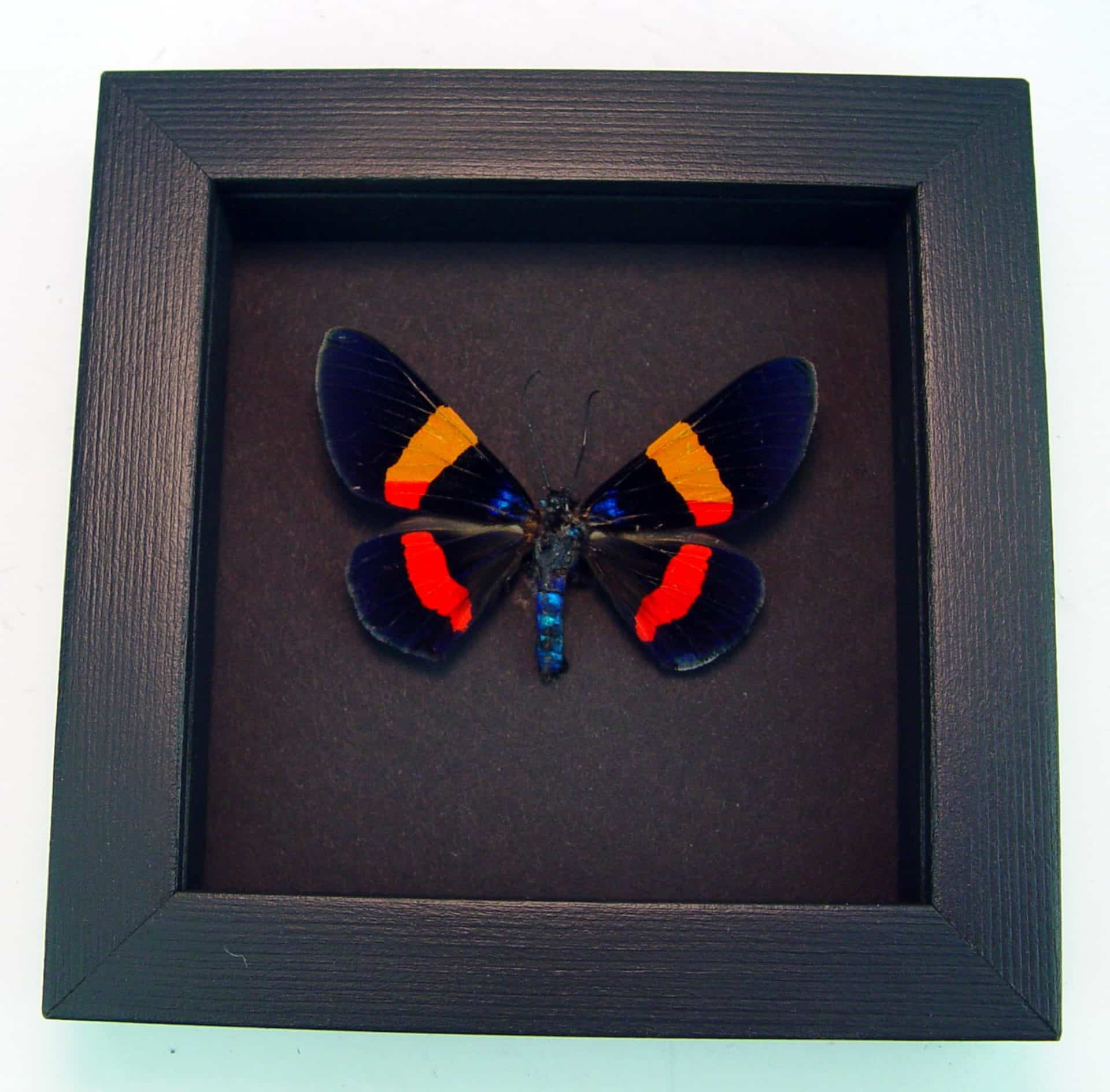 Description: Rare hard to get day flying moth with blue and red markings and a metallic blue body from Indonesia.