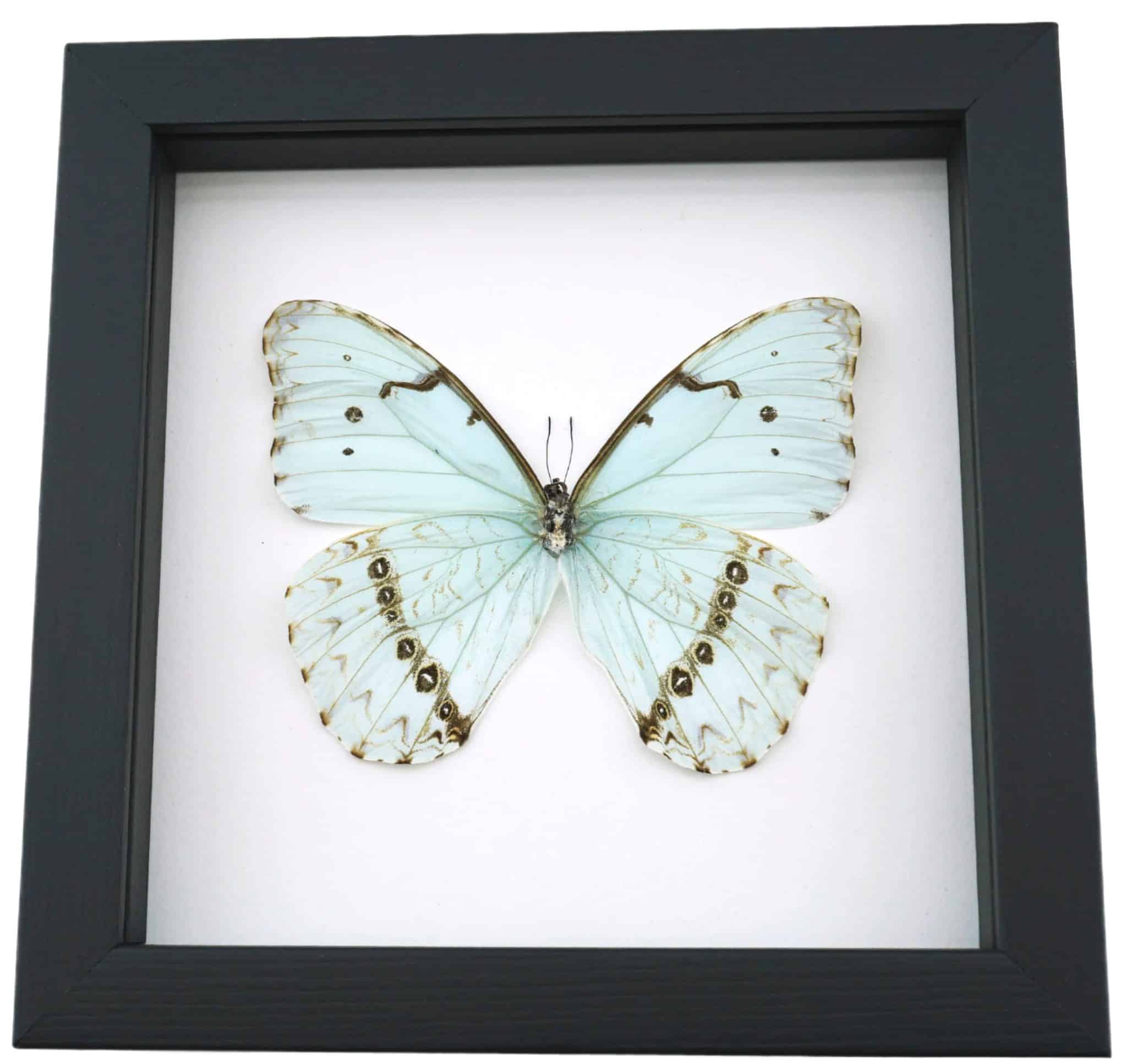 Description: This verso mounted butterfly is commonly known as the Mint Morpho Morpho. There are over 80 species of blue morpho butterflies mostly found in South America as well as Mexico and Central America. Most Morpho butterflies are bright metallic blues but this morpho is a rare exception it is a pale aqua blue.