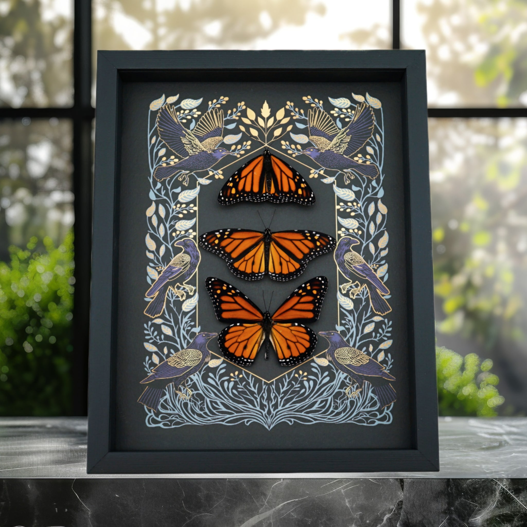 Background: Gothic Ravens golden scrolls Print with Specimen name and country of origin included on back of frame.