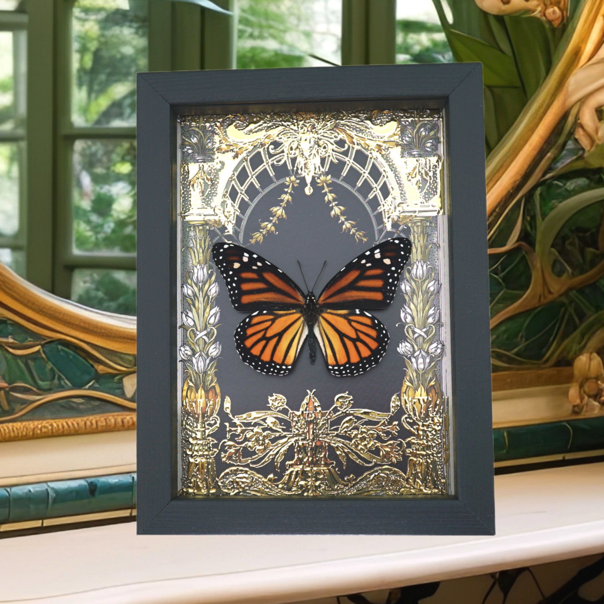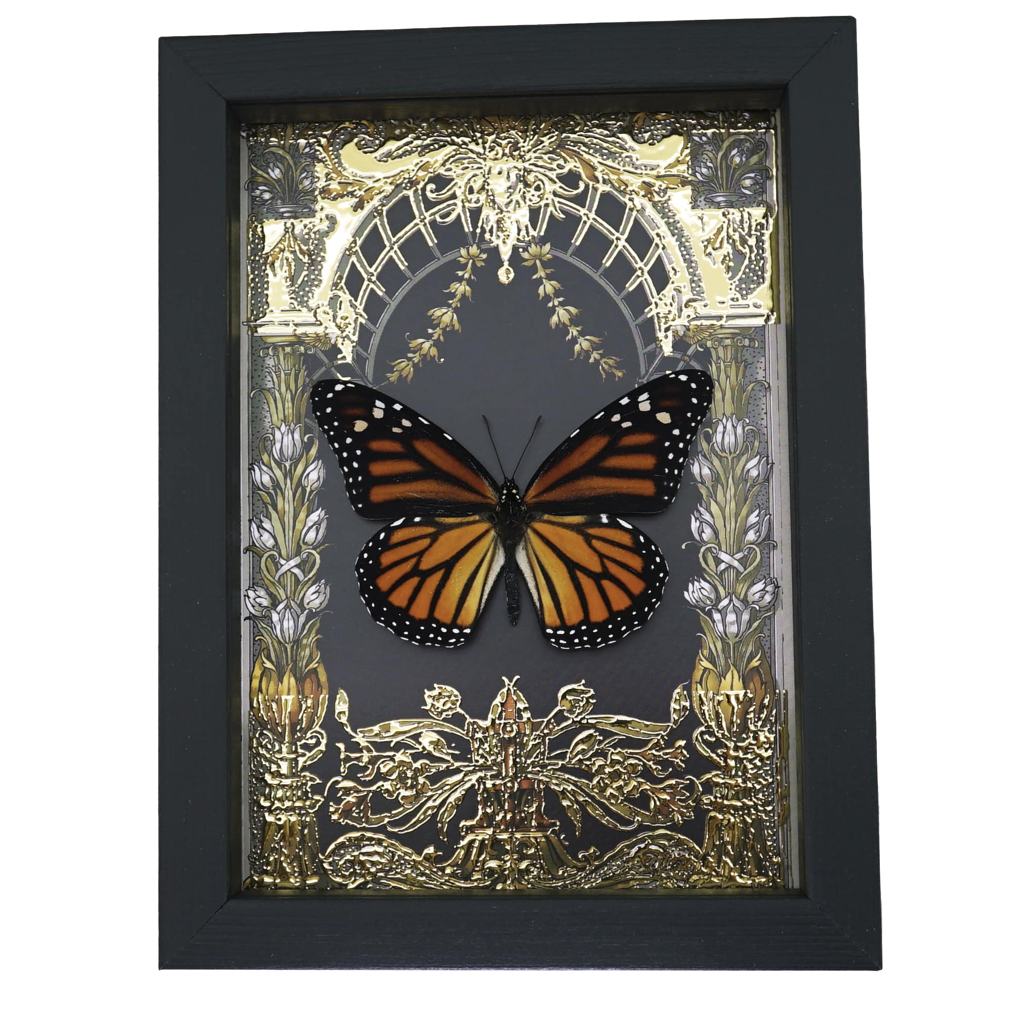 Monarch Butterfly Gold Foil Art Nouveau Garden Danaus Plexippus Female Framed Taxidermy