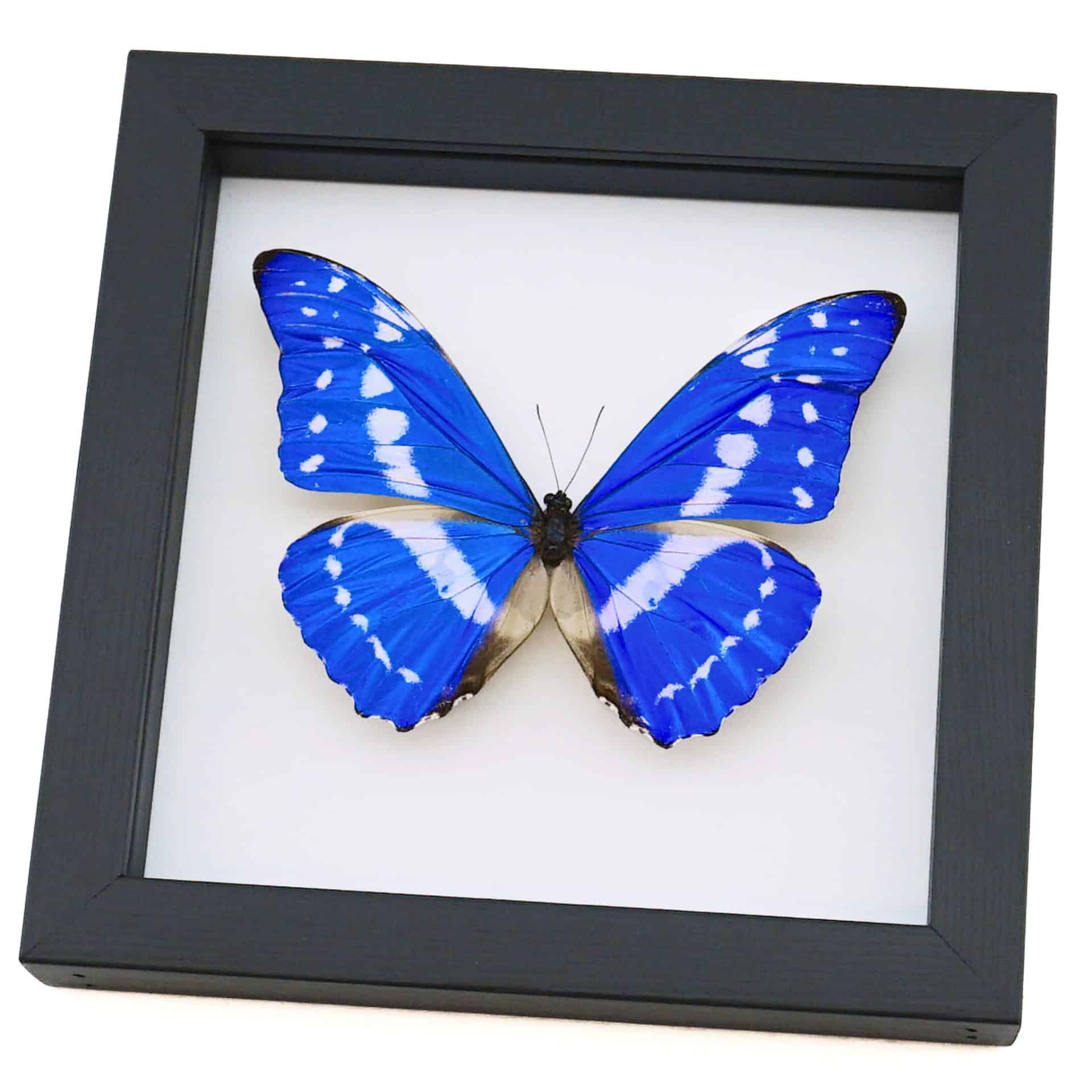Description: This rare and hard to find blue morpho has white spots and markings making it one of the most beautiful morpho butterflies. There are over 80 species of blue morpho butterflies mostly found in South America as well as Mexico and Central America.