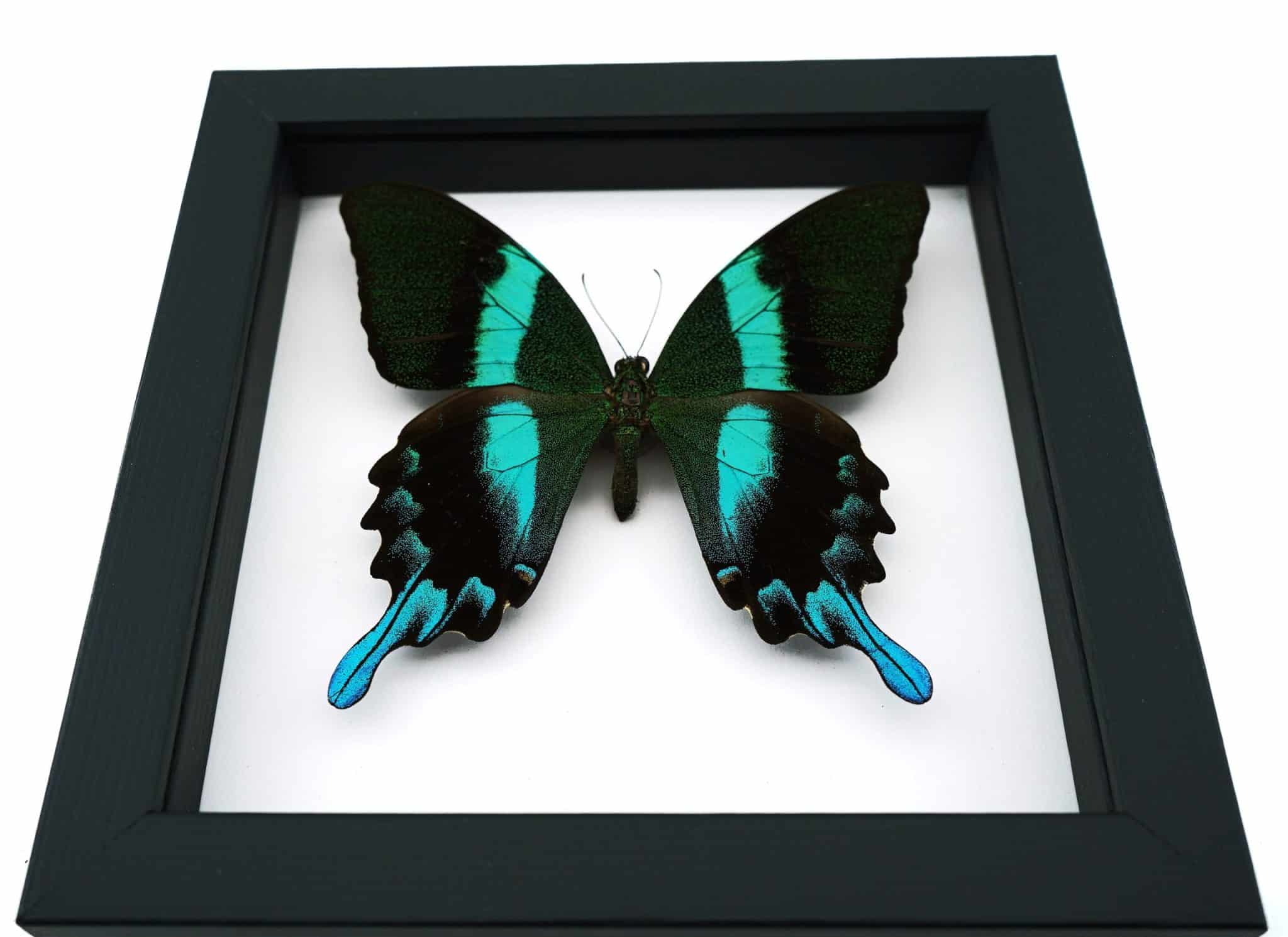 Description: Large Metallic green swallowtail with blue tails commonly known as the Peacock Swallowtail Framed Taxidermy Butterfly Papilio blumei.