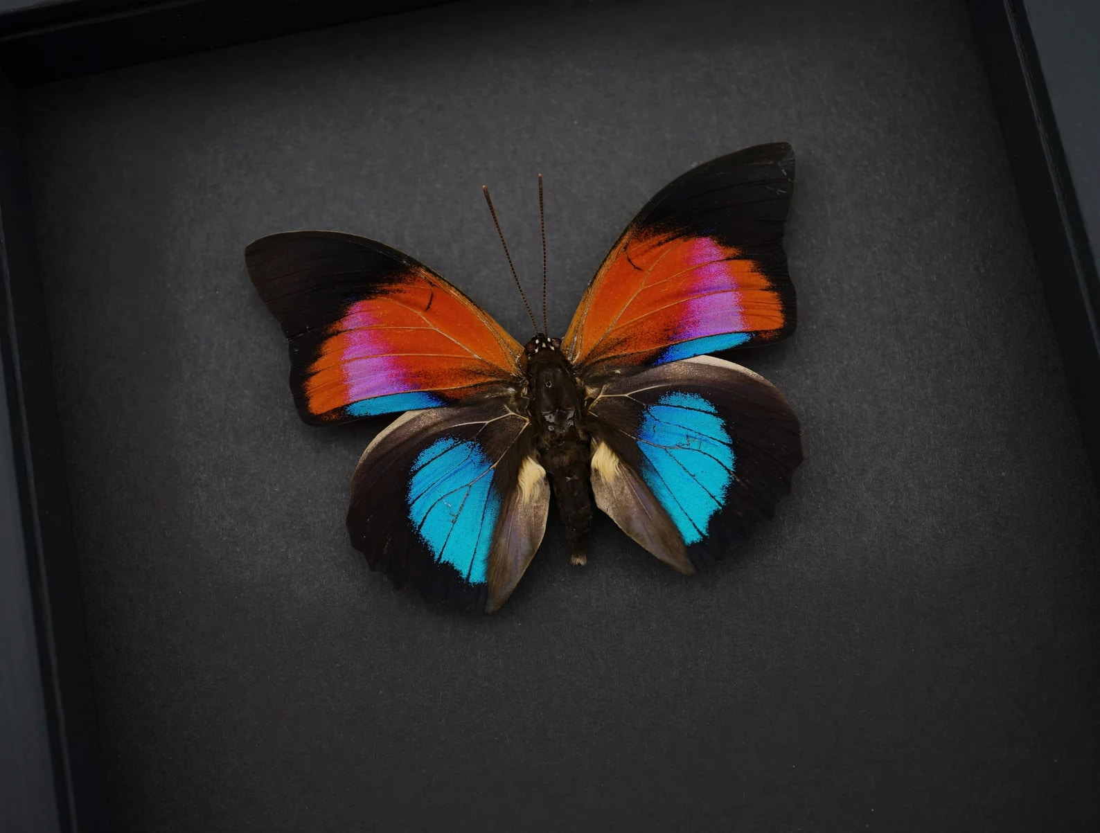 Rare Blue Red Fuchsia Hybrid Butterfly Agrias claudina lugens Prepona dexamenus Framed Moonlight Display