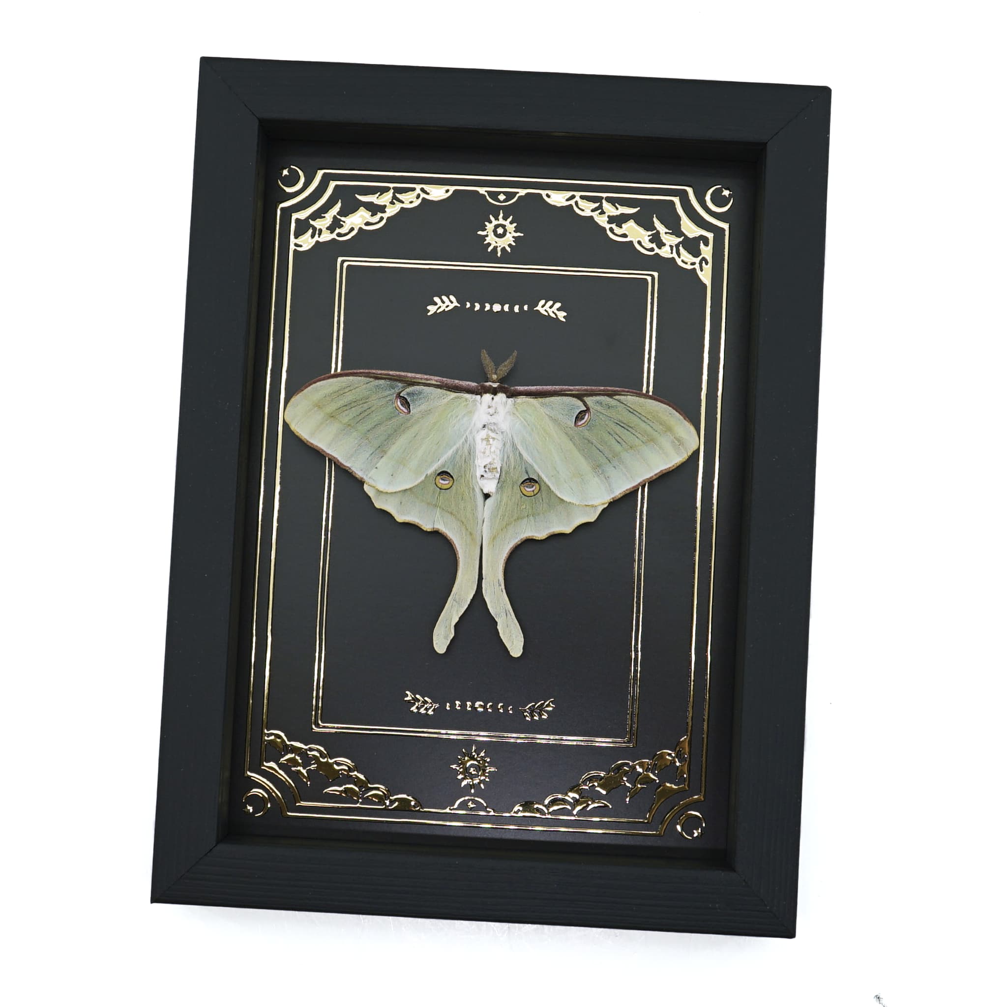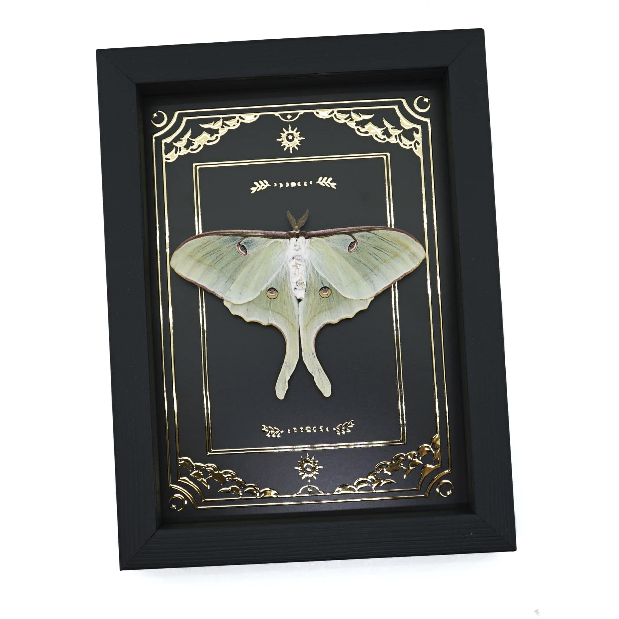 Real Framed Luna Moth Gold Foil Celestial Actias luna Resting Taxidermy Display