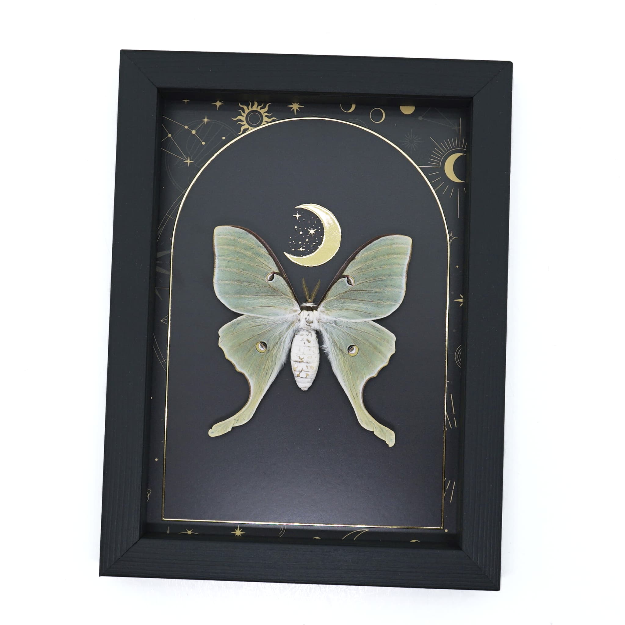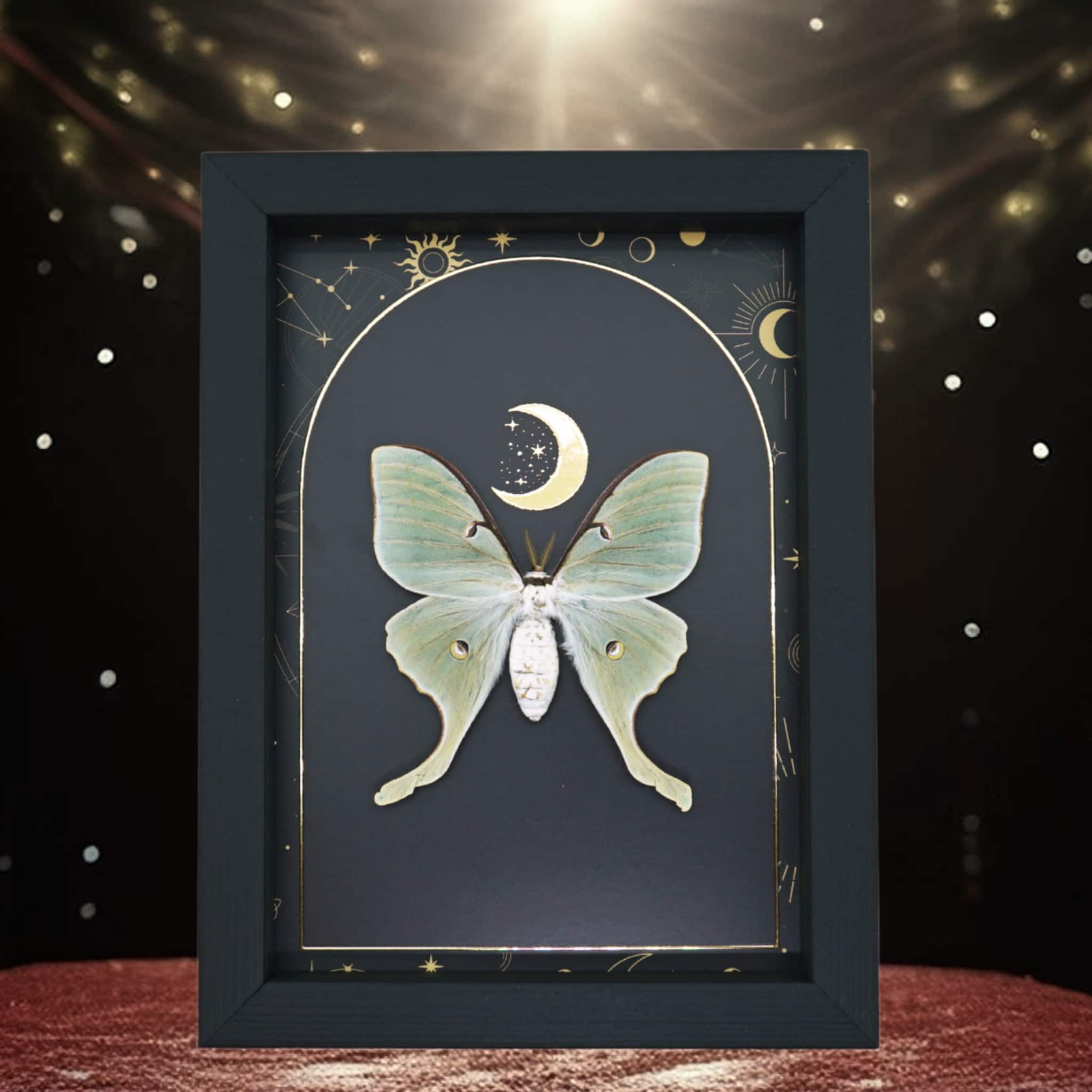 Real Framed Luna Moth Gold Foil Celestial Moon Actias luna Taxidermy Display