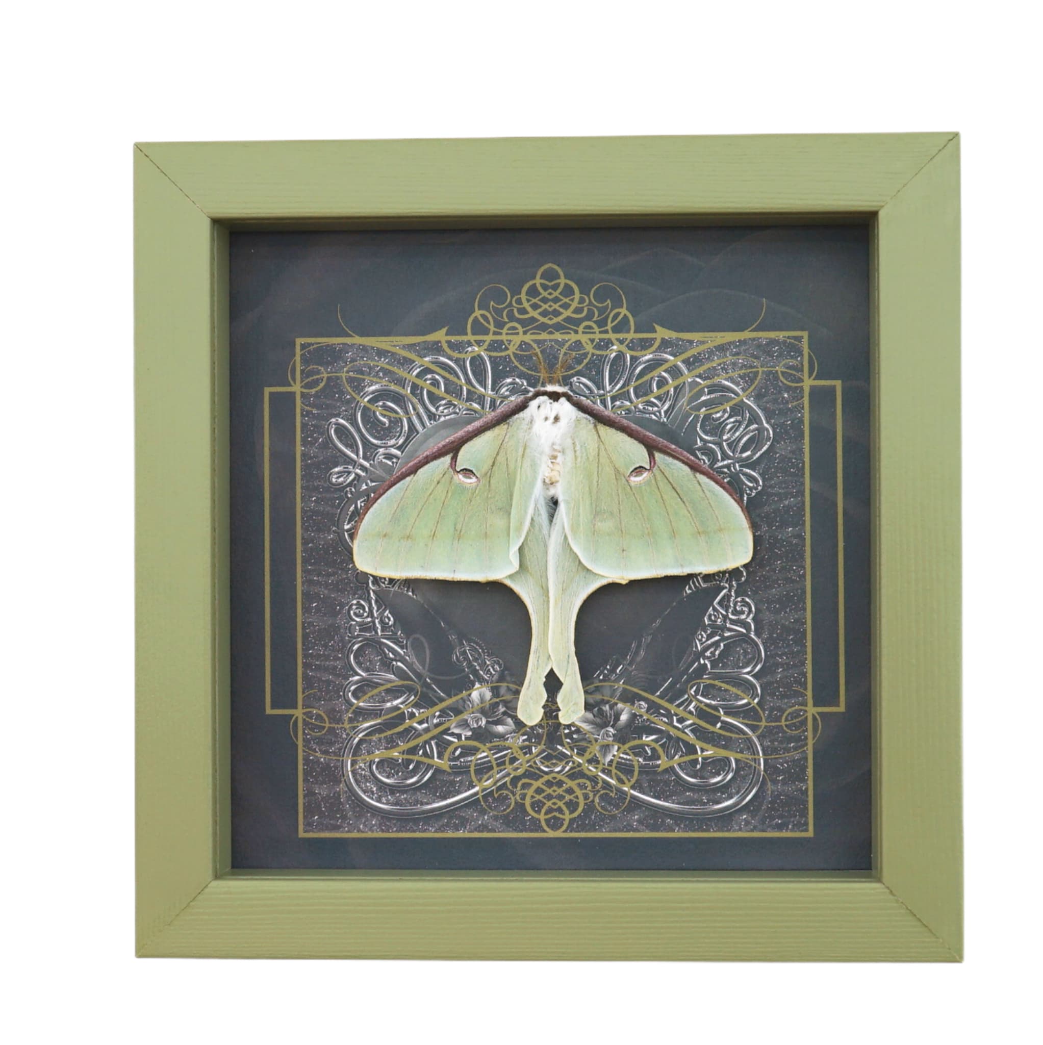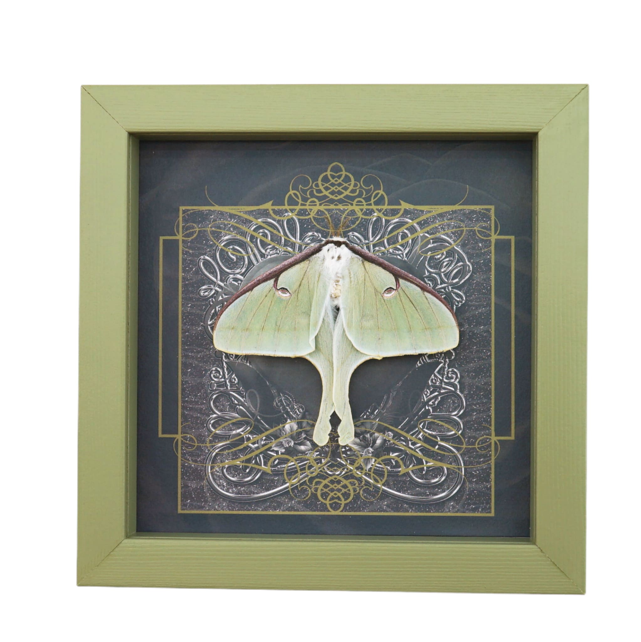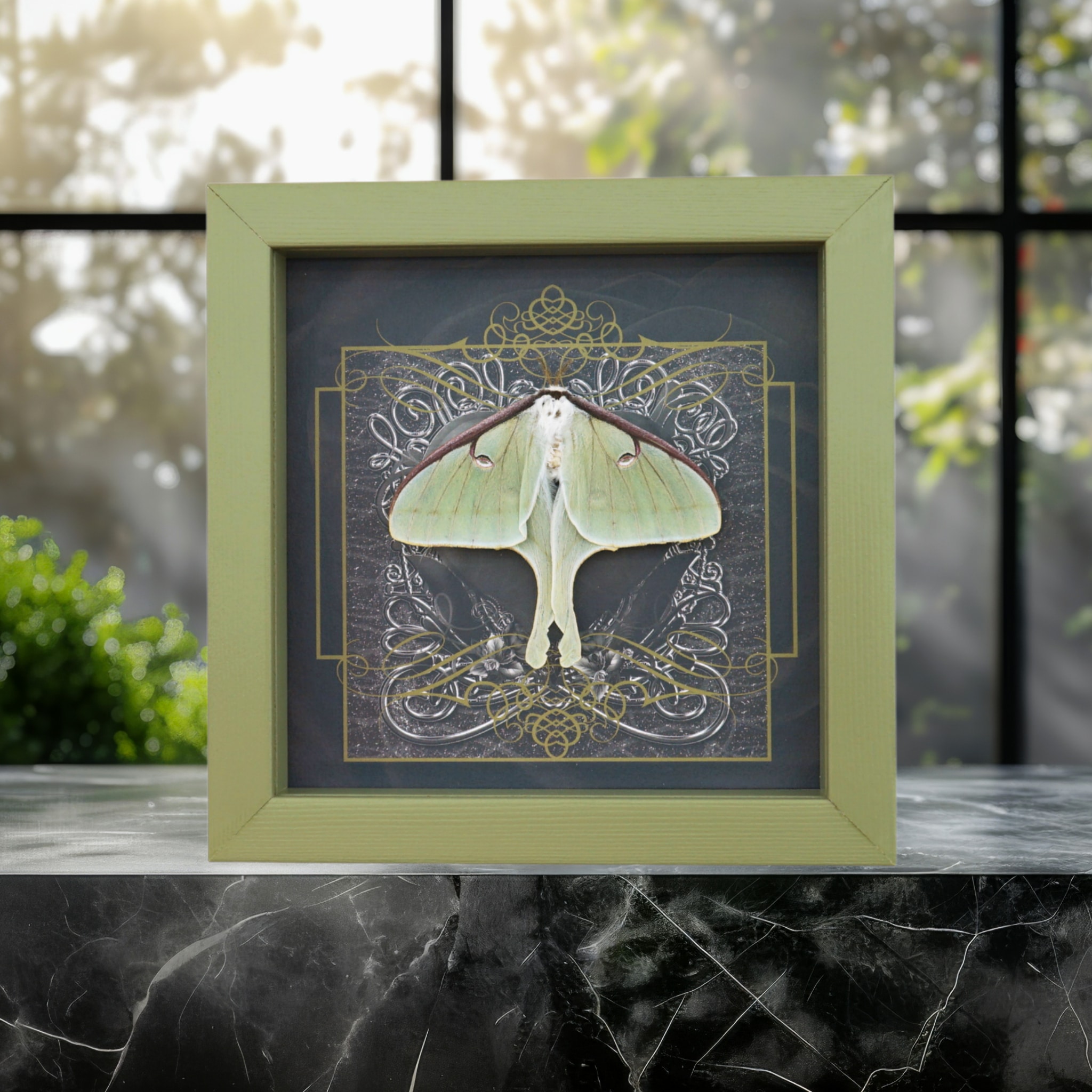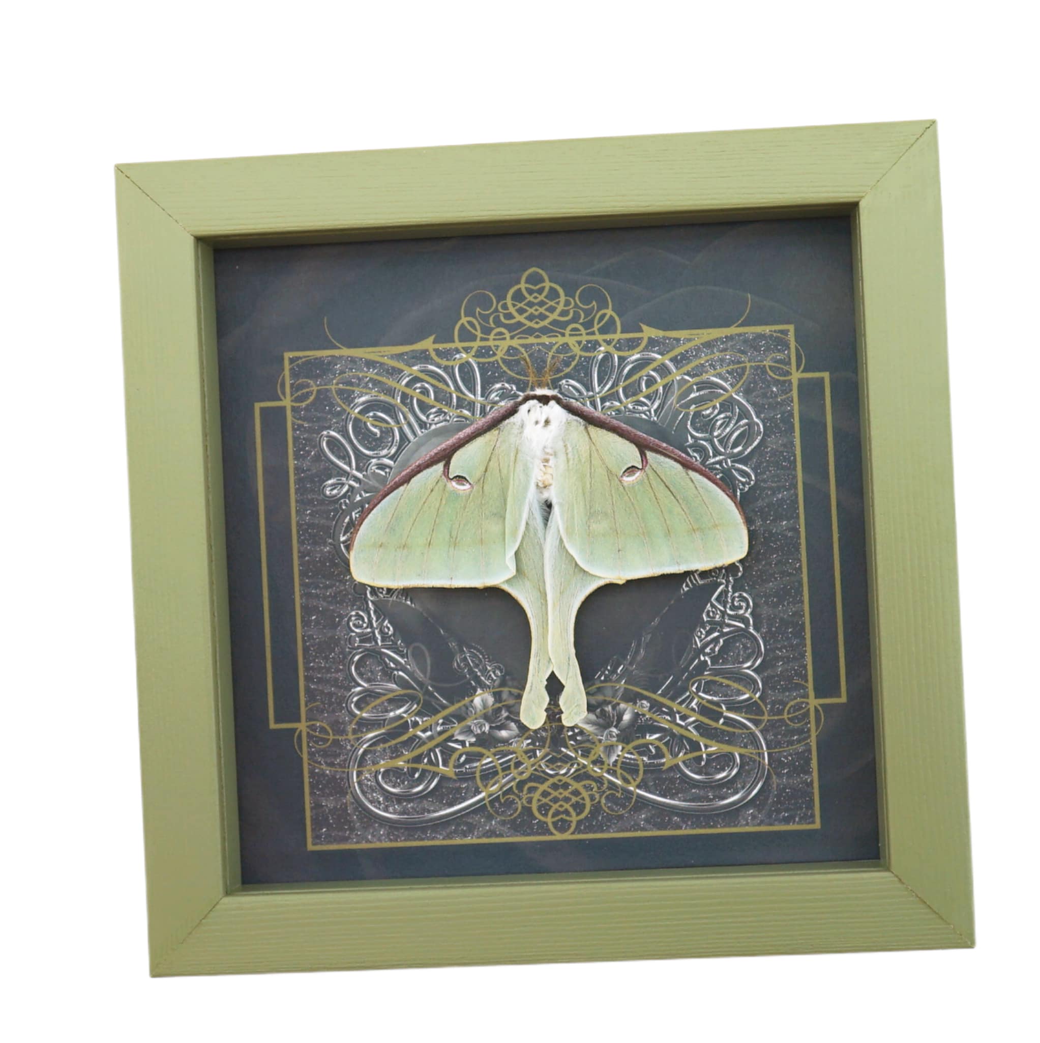Real Framed Luna Moth Gothic Black Heart Actias luna Resting Taxidermy Sage Green Display