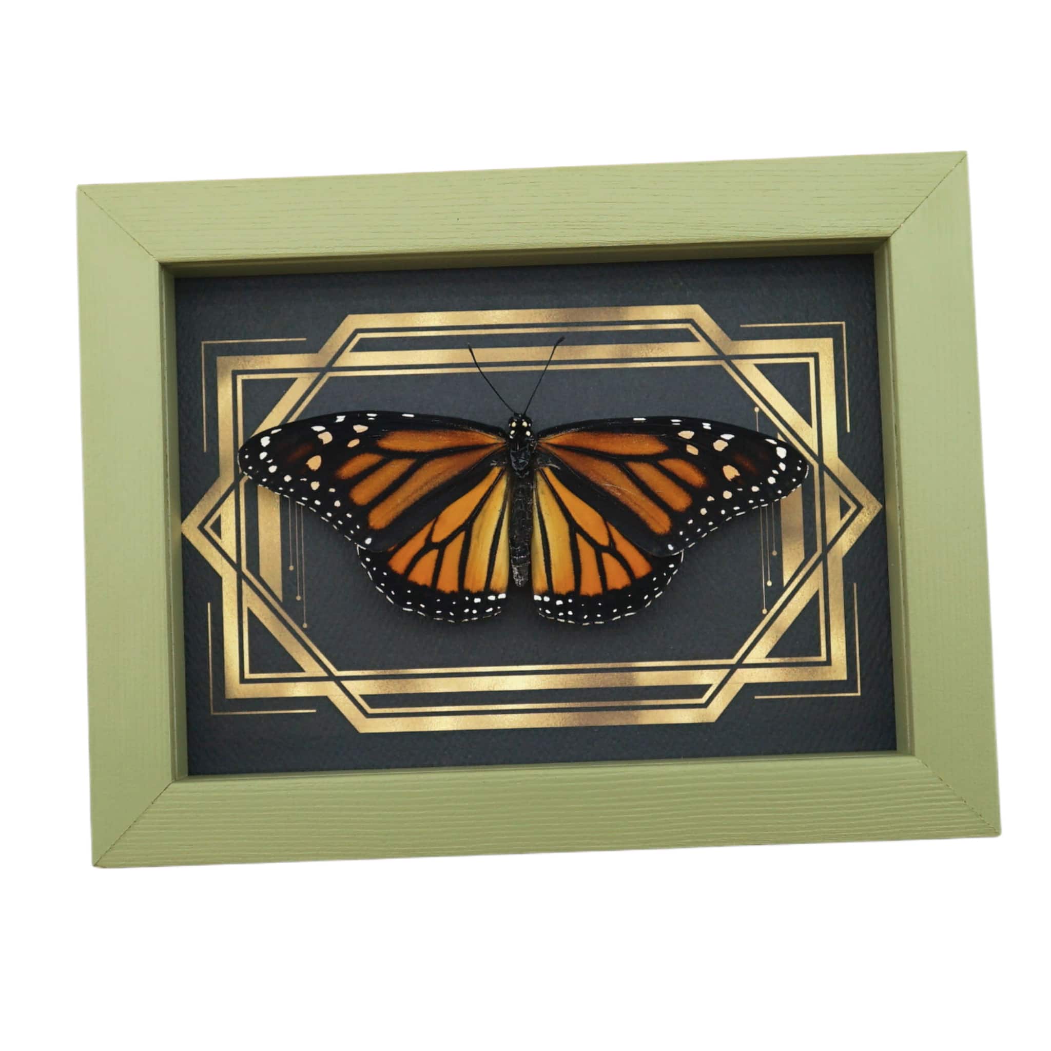 Real Framed Monarch Butterfly Art Deco Double Border Danaus plexippus Female Resting Taxidermy Sage Green Display