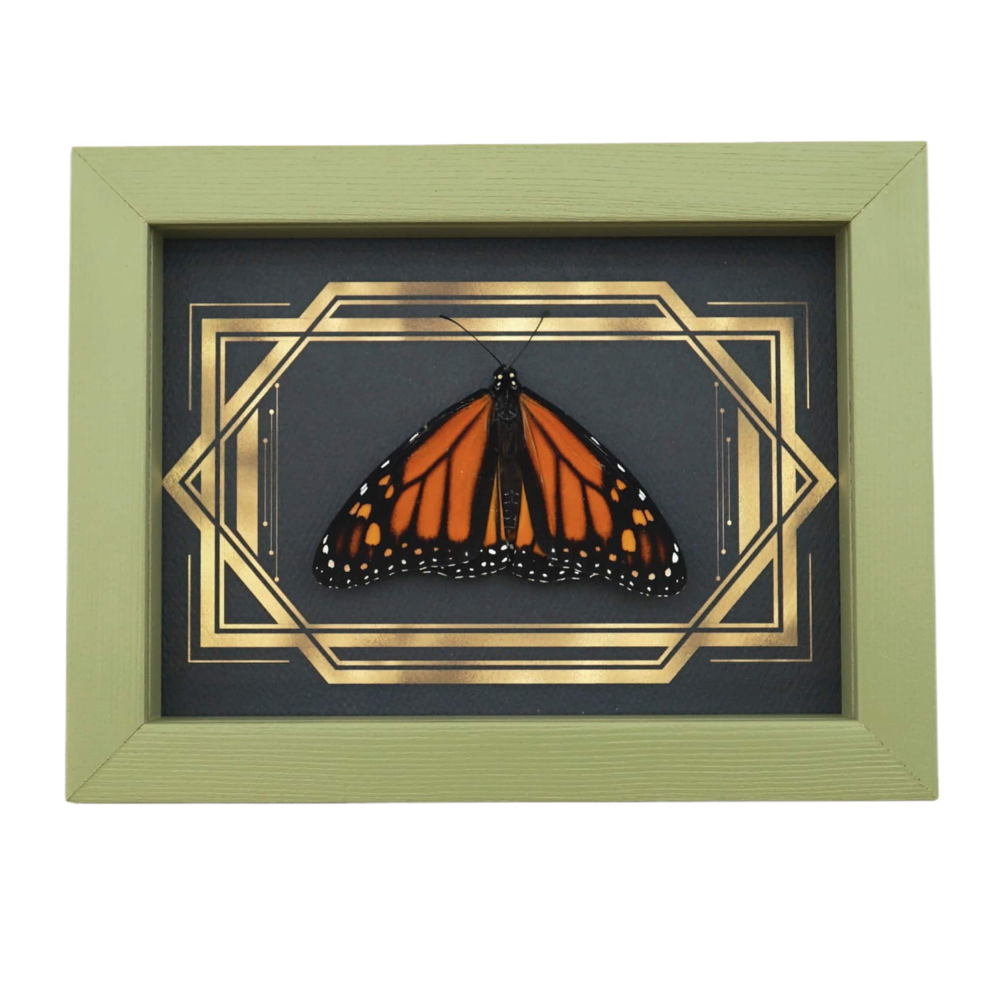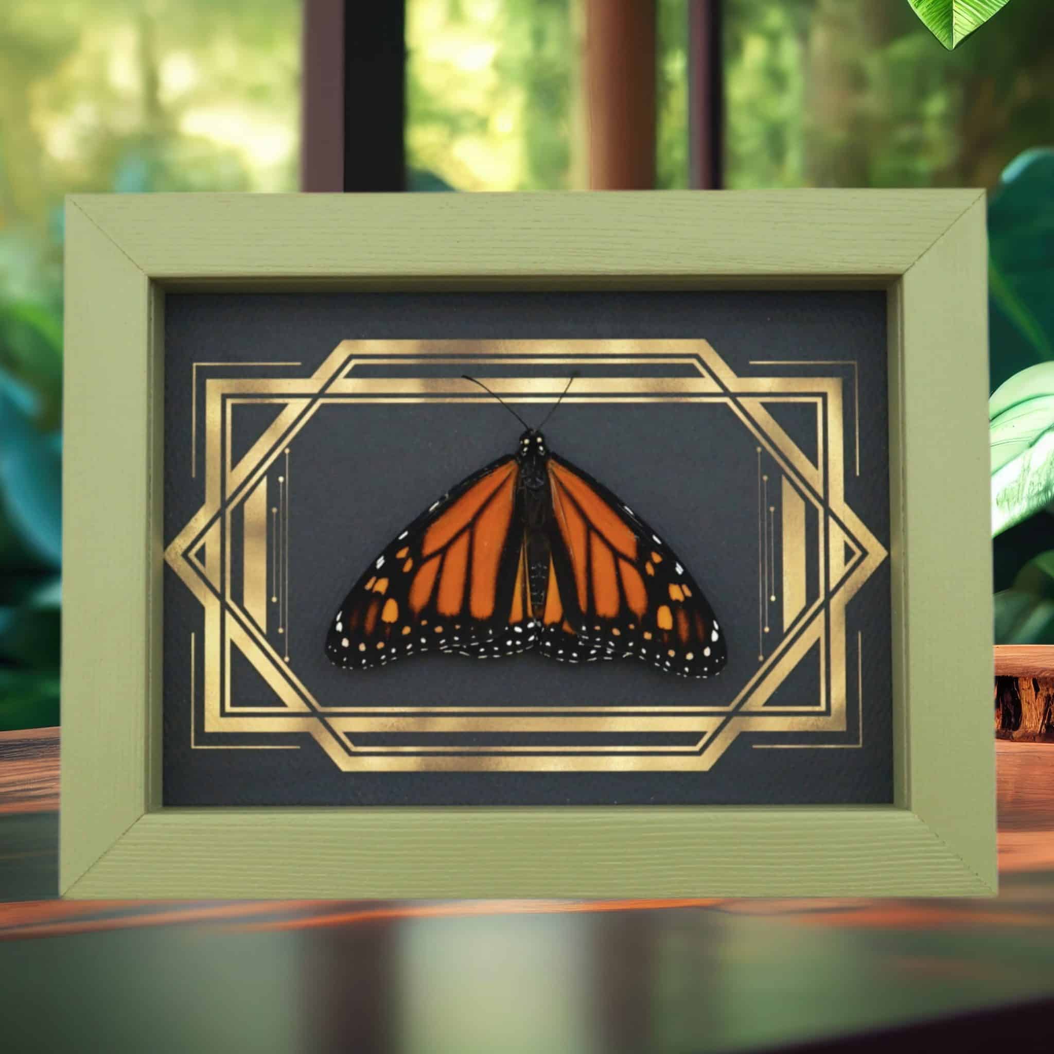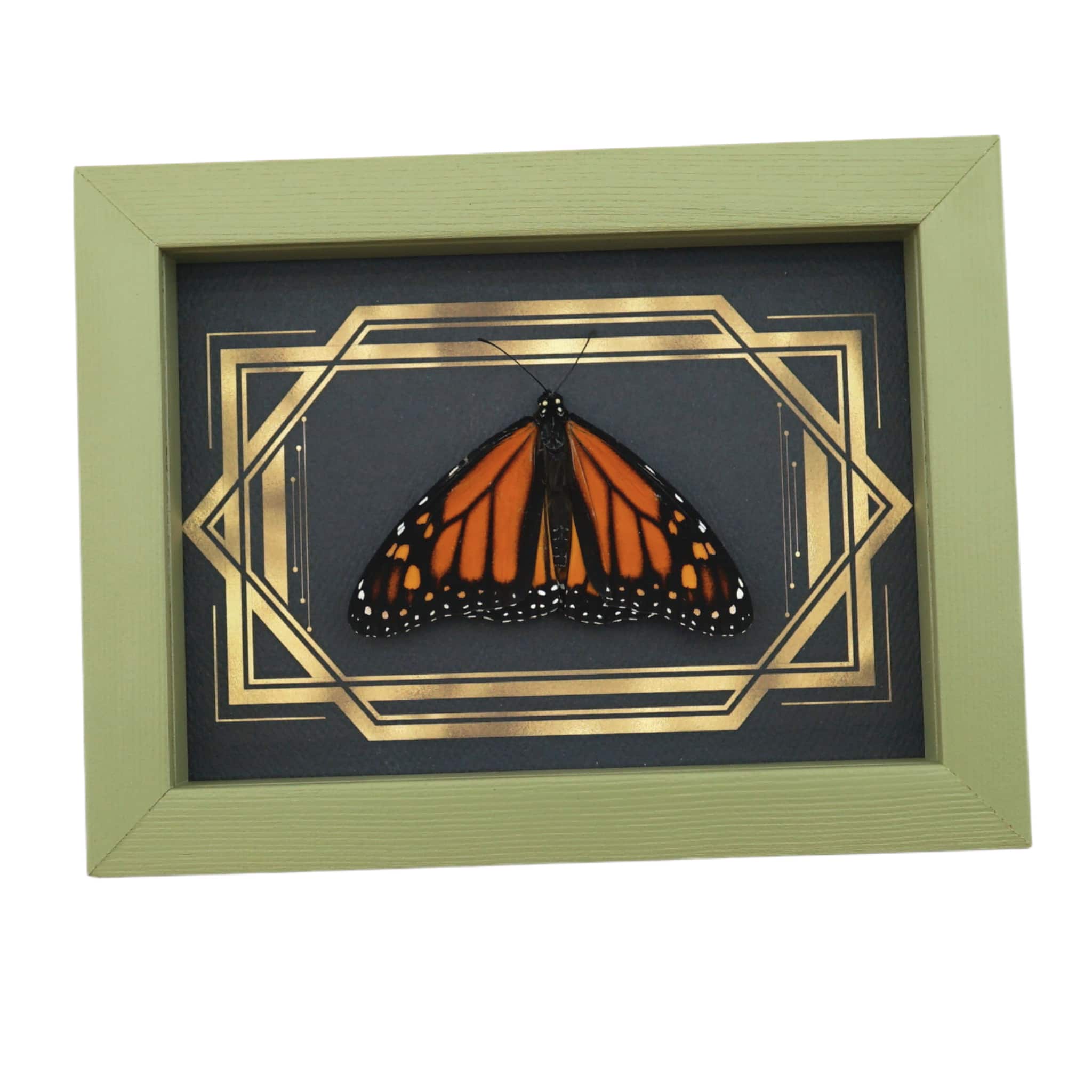 Real Framed Monarch Butterfly Art Deco Double Border Danaus plexippus Resting Taxidermy Sage Green