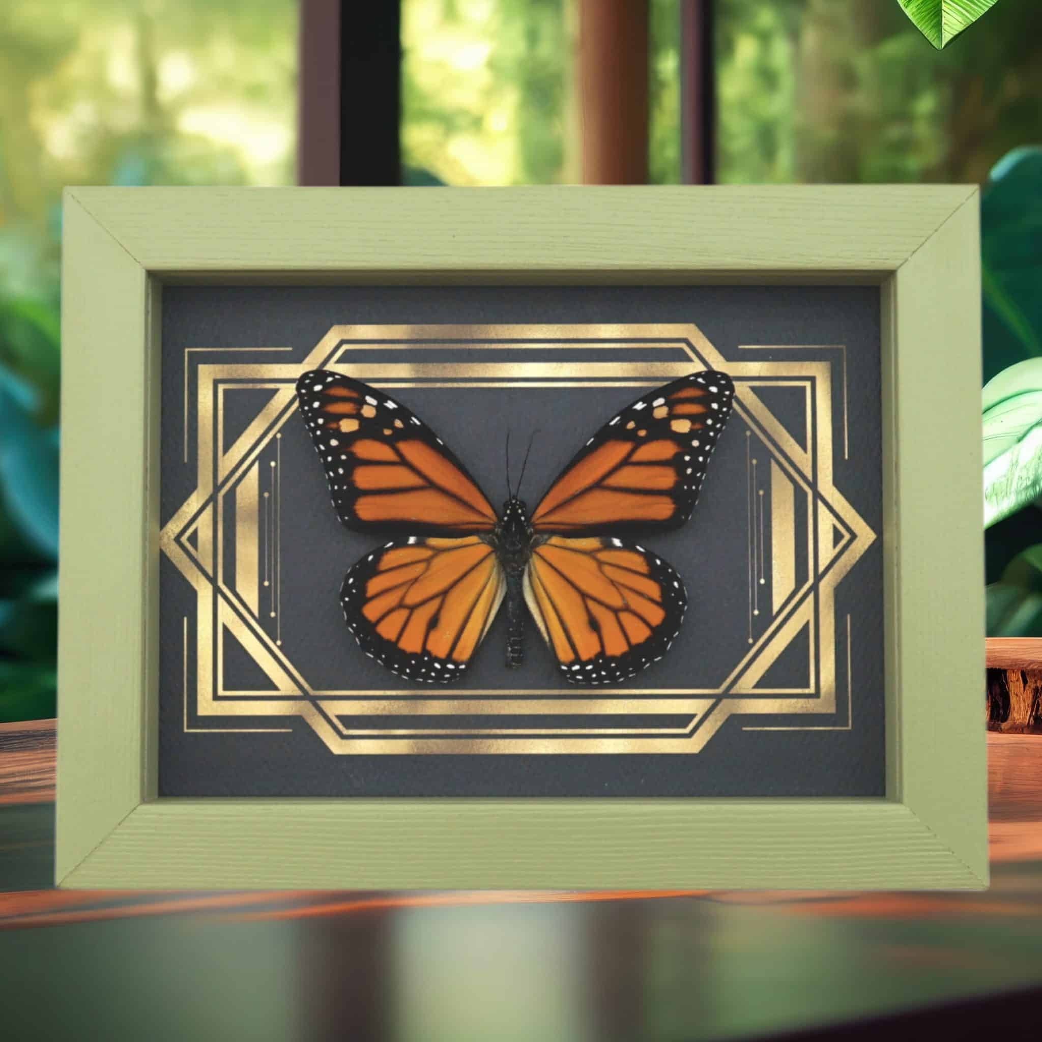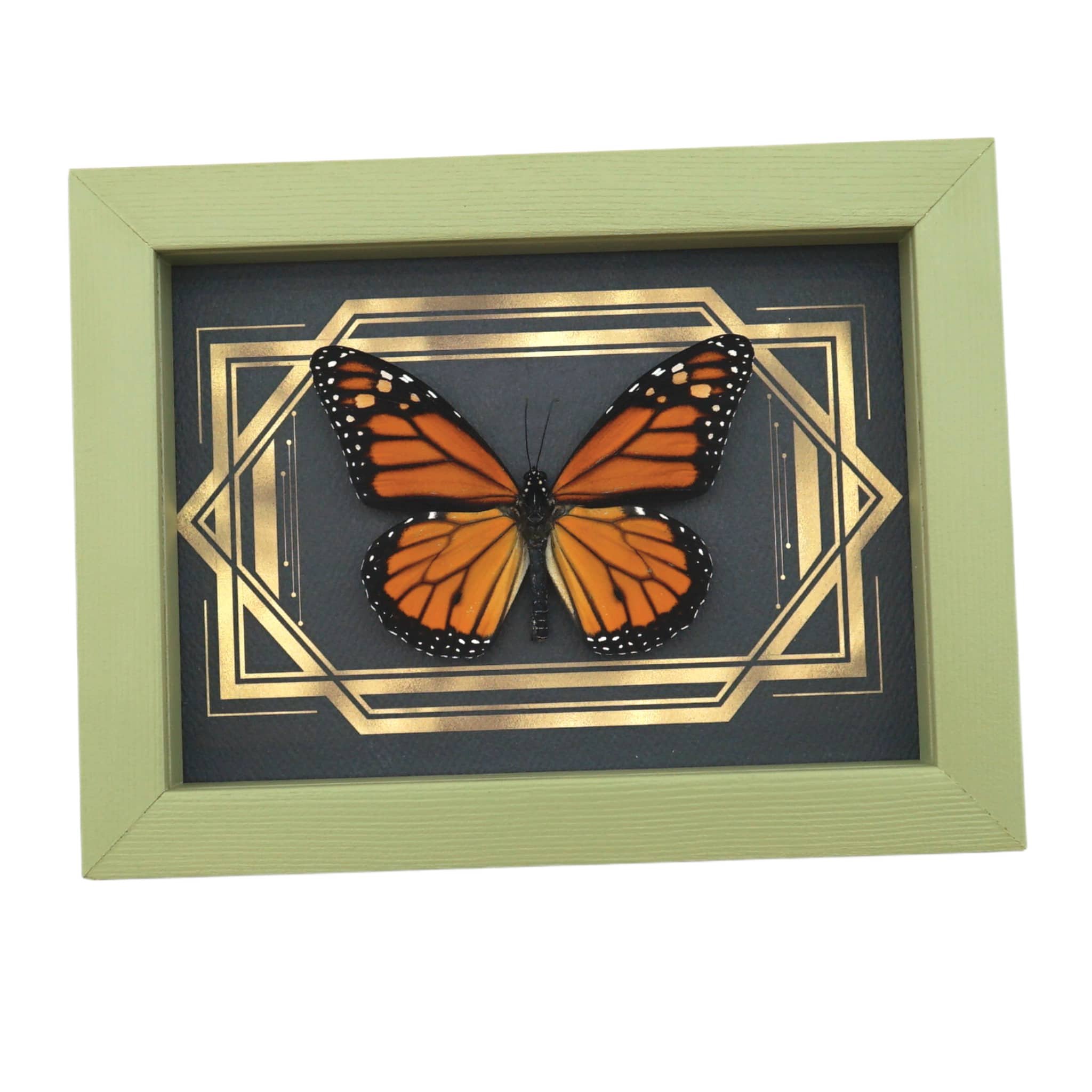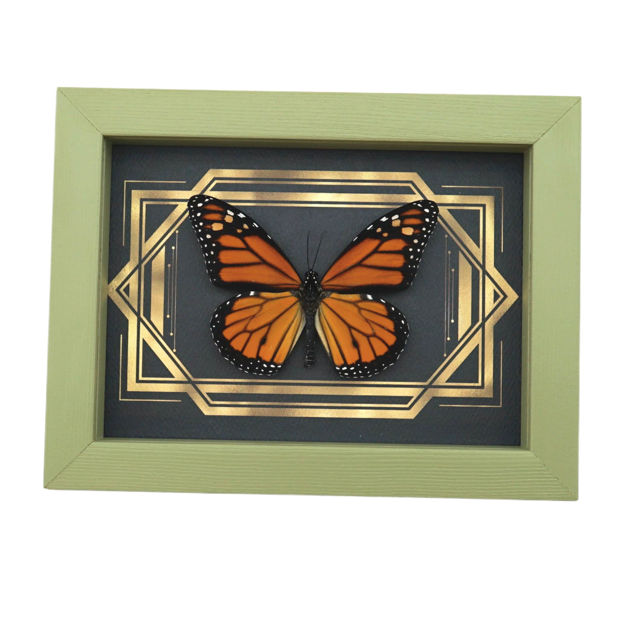 Real Framed Monarch Butterfly Art Deco Double Border Danaus plexippus Taxidermy Sage Green Display