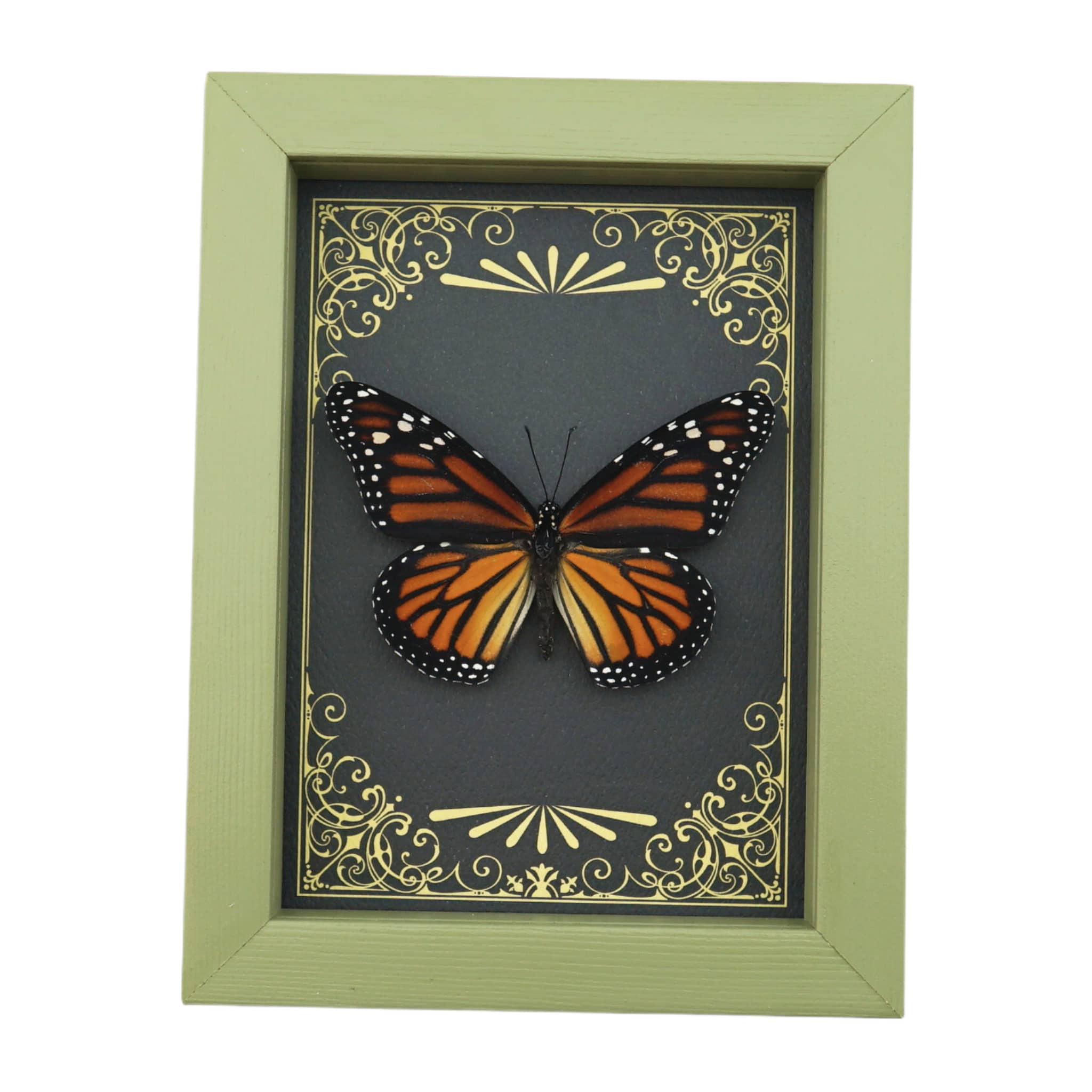 Real Framed Monarch Butterfly Art Deco Golden Scrolls Danaus plexippus Female Taxidermy Sage Green Display