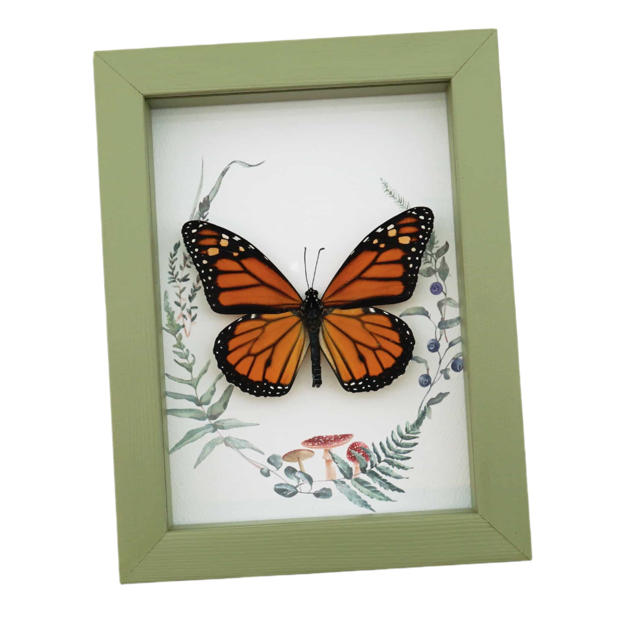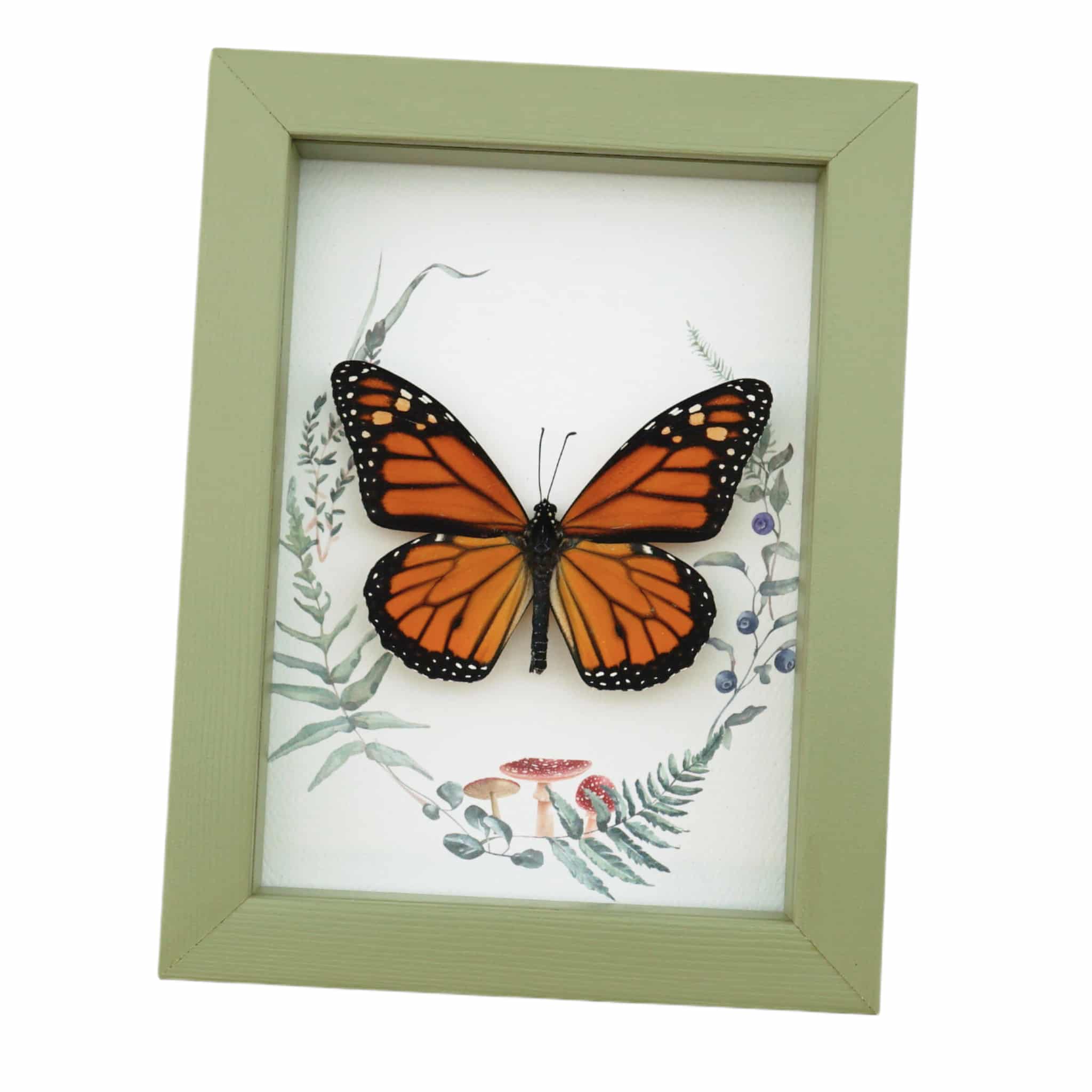 Real Framed Monarch Butterfly Ferns Mushrooms Danaus plexippus Taxidermy Sage Green Display