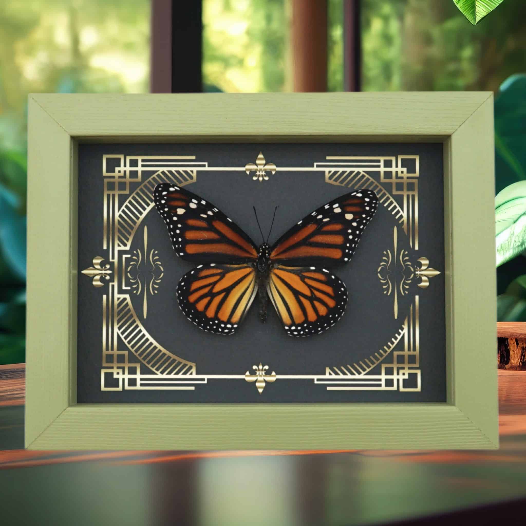 Real Framed Monarch Butterfly Gothic Scrolls Danaus plexippus Female Taxidermy Sage Green Display