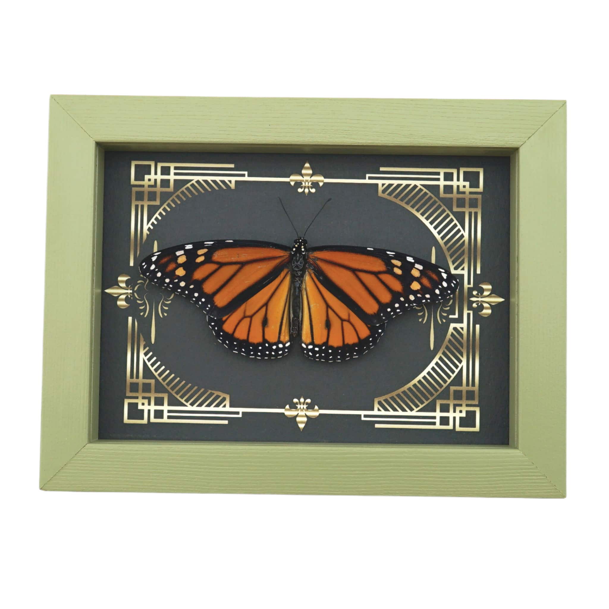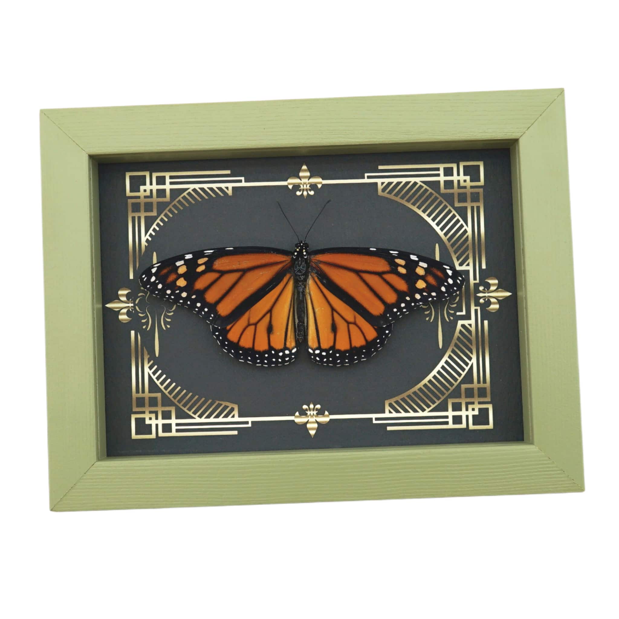 Real Framed Monarch Butterfly Gothic Scrolls Danaus plexippus Resting Taxidermy Sage Green Display