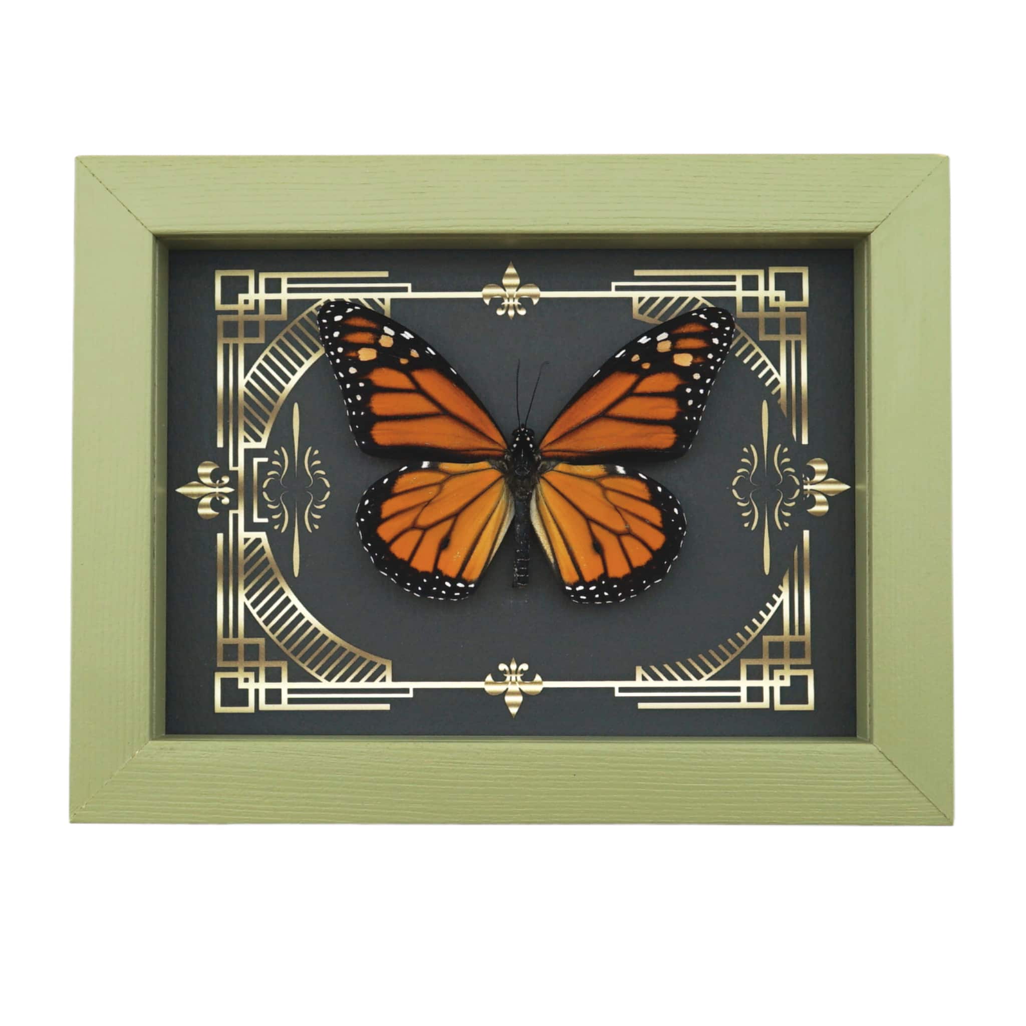 Real Framed Monarch Butterfly Gothic Scrolls Danaus plexippus Taxidermy Sage Green Display