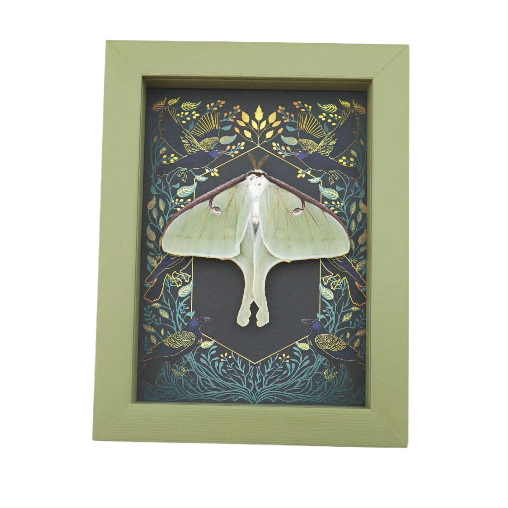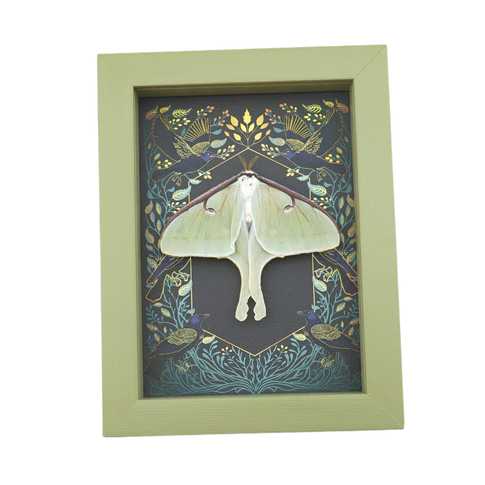 Real Luna Moth Gothic Ravens Actias luna Resting Framed Taxidermy Sage Green Display