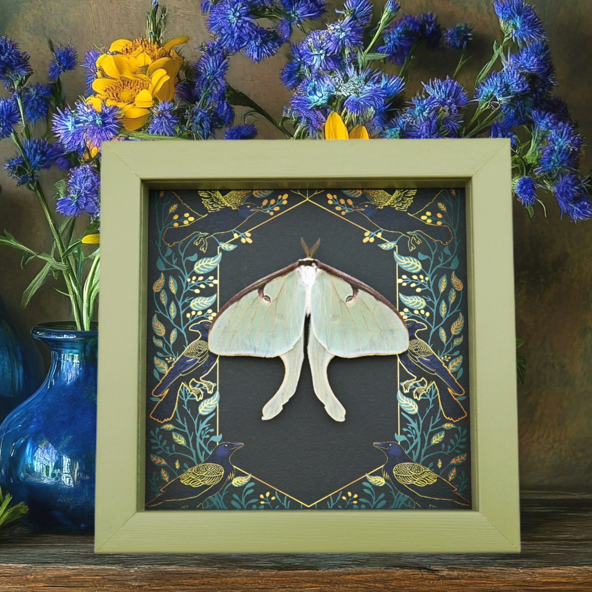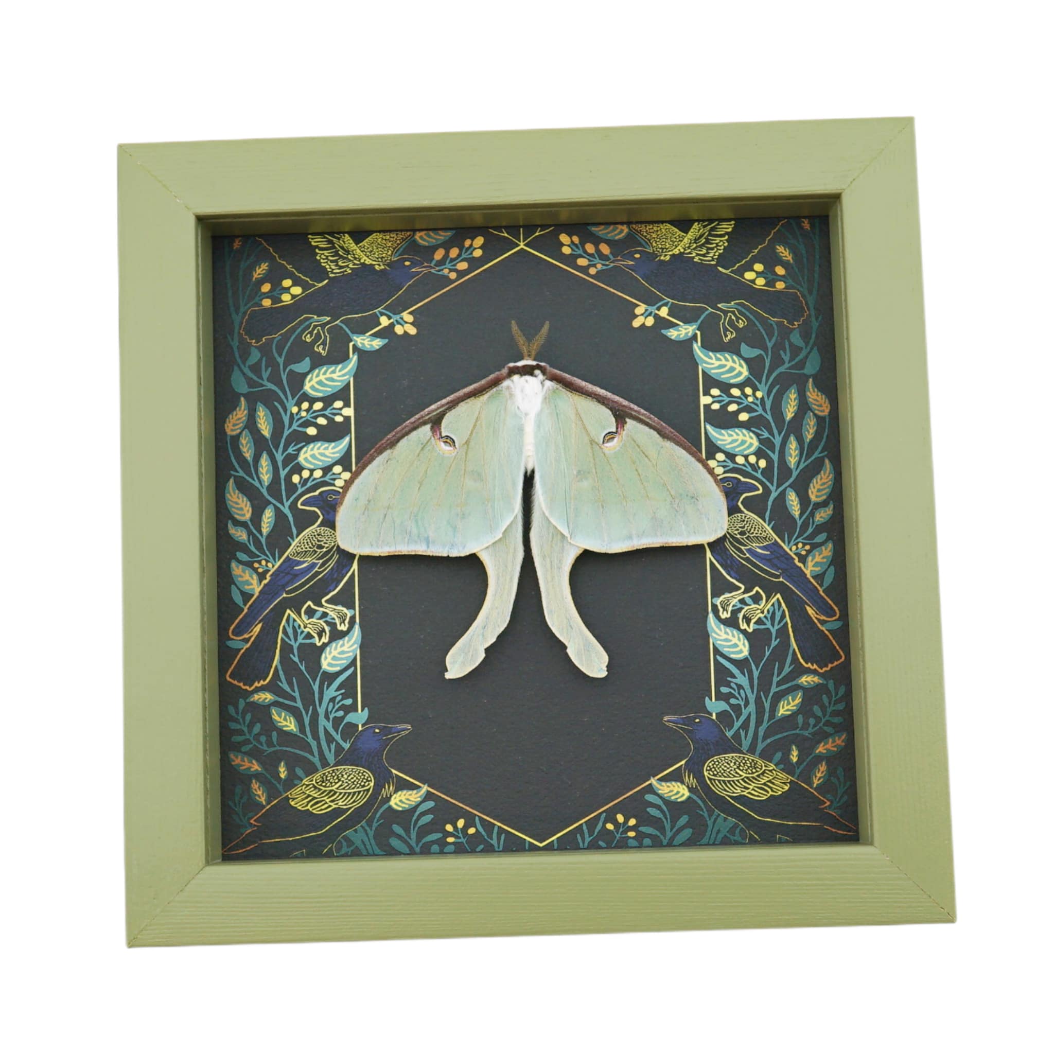 Real Luna Moth Gothic Ravens Actias luna Resting Framed Taxidermy Sage Green
