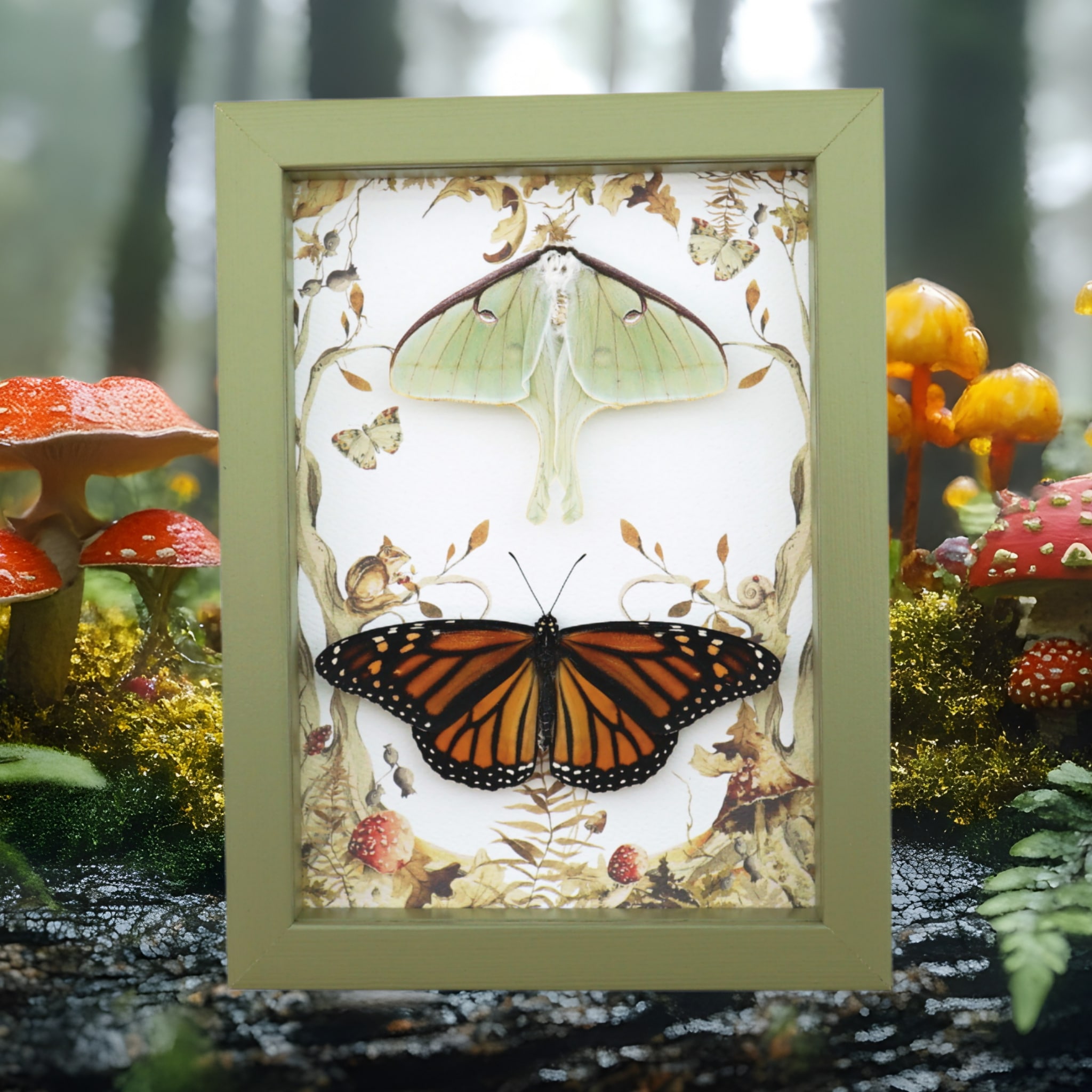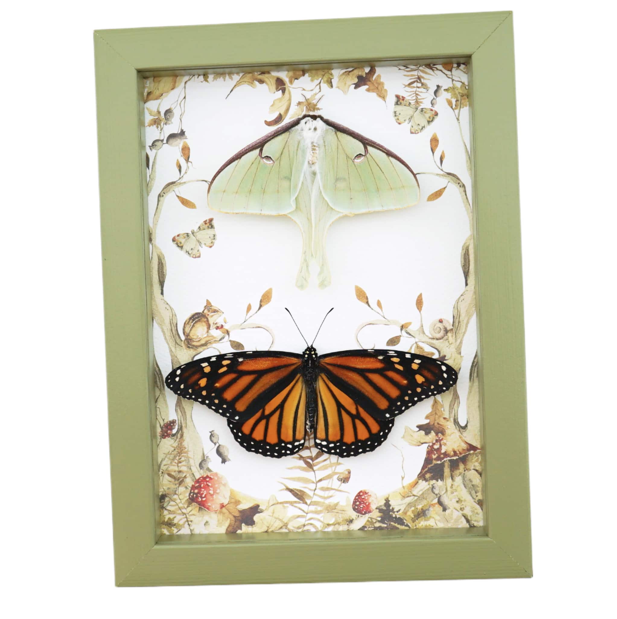 Real Monarch Butterfly Luna Moth Collection Framed Taxidermy Sage Green Display