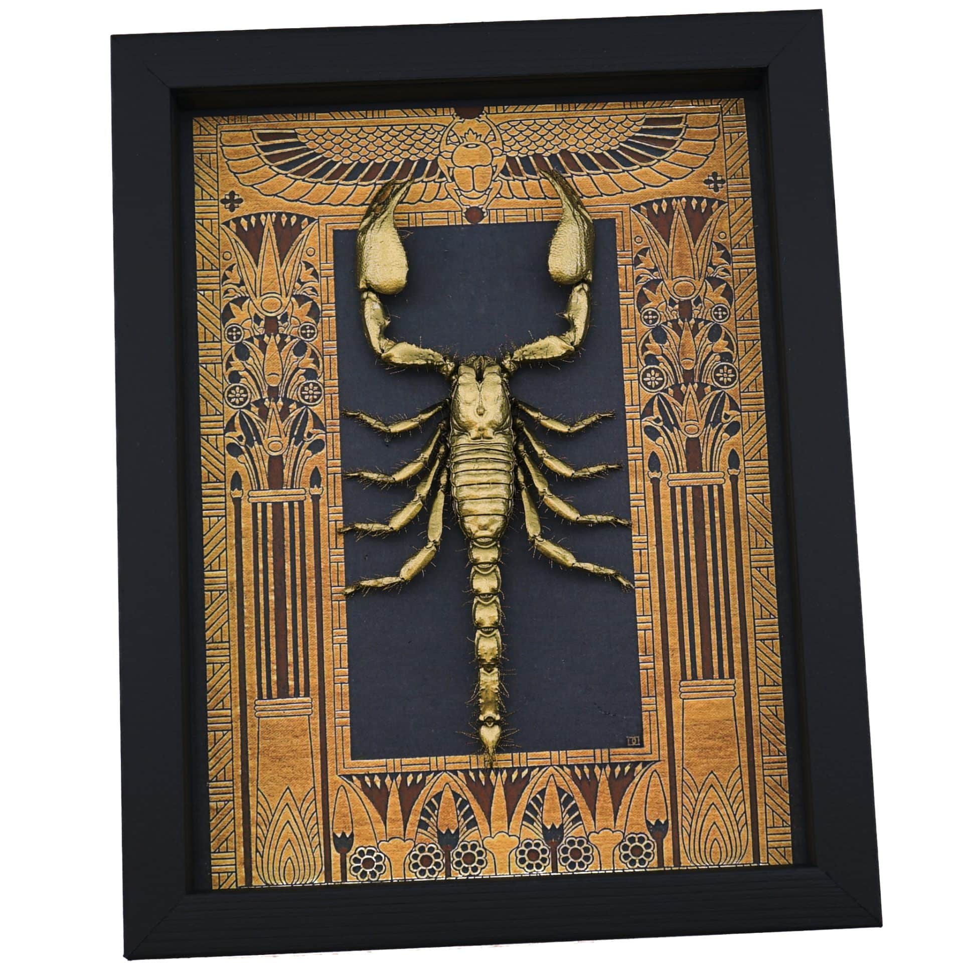 Description: Real scorpion on an Egyptian decor print. This real scorpion has been painted with a bronze colored finish. This scorpion is mounted with it’s pinchers in a realistic fighting position.