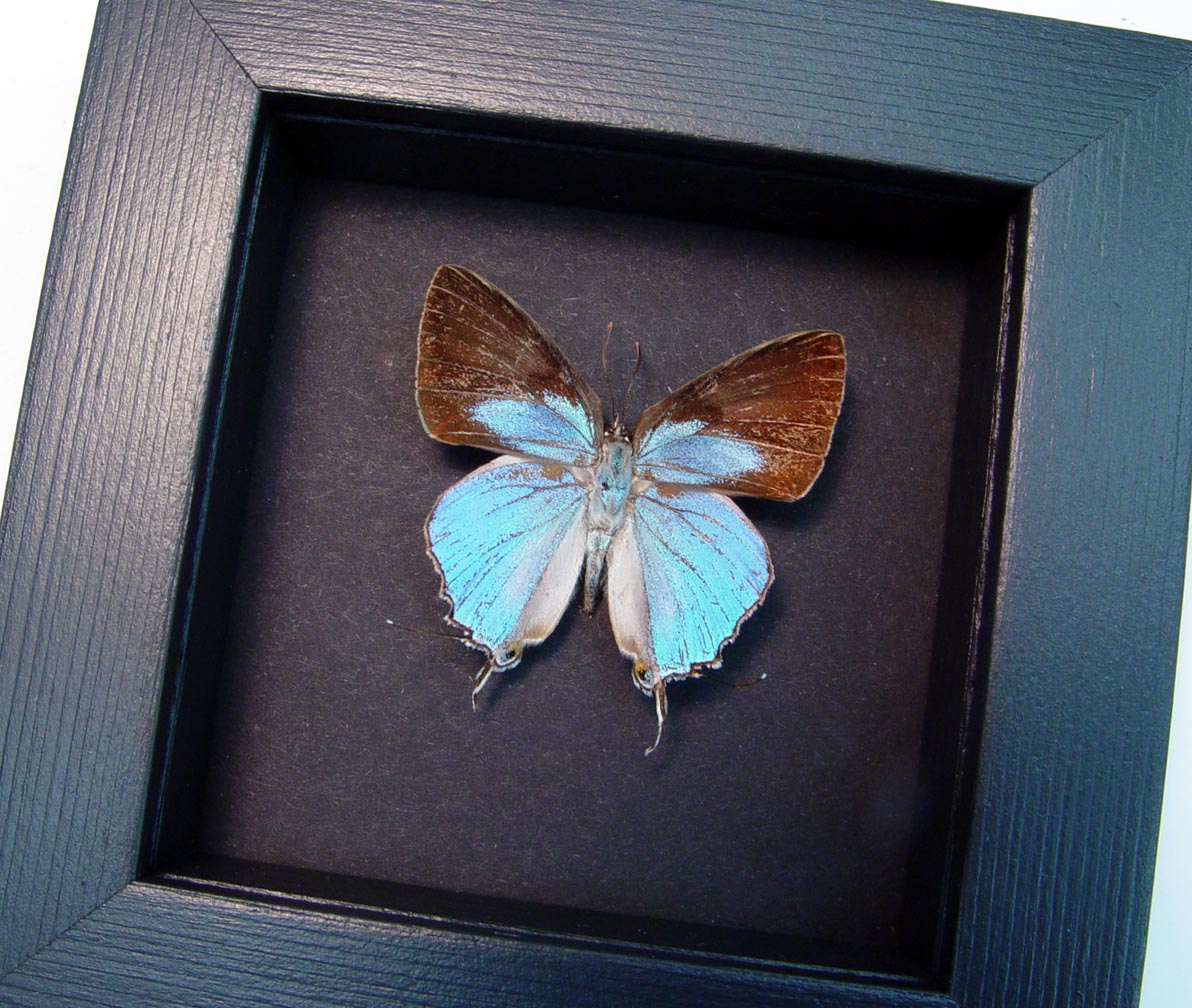 Description: Tajuria cyrillus Male Blue Swallowtail Rare blue male butterfly with tiny tails. This butterfly is only found in Sulawesi Indonesia.