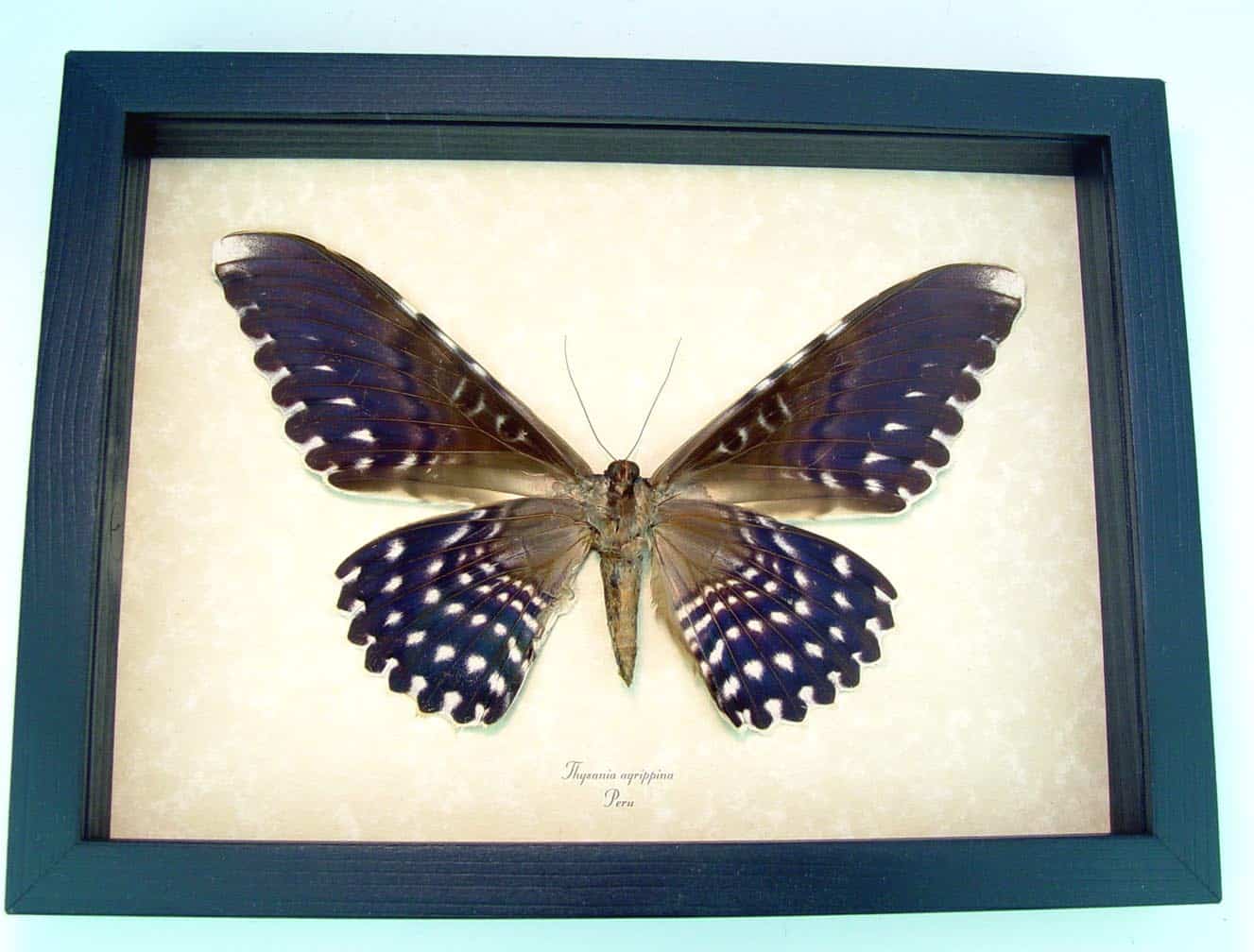 Description: This moth has the largest wingspan of any moth in the world and is commonly known as the White Witch Moth or Birdwing Moth! This moth is mounted verso to show the more colorful purple sheen side. This huge moth has a wingspan of 8″+ a true giant!